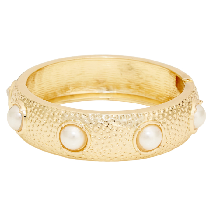 Bραχιόλι μεταλλικό ανοιγόμενο, χειροπέδα με πέρλες περιμετρικά Υλικό: Mέταλλο / PU Χρώμα: Xρυσό / Λευκό