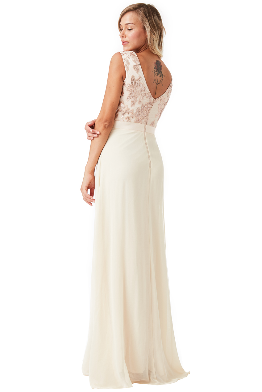 Bridal, νυφικό φόρεμα με chic συνδυασμό υλικών σε απόχρωση champagne/ caramel χρυσό. Το top είναι σχεδιασμένο με βαθύ V σε σατέν με απλικαρισμένο τούλι & detailed τελείωμα με κέντημα mini paillettes. Έχει matching φάσα κάτω από το στήθος & πλούσιο, αέρινο σιφόν πλήρως φοδραρισμένο με σούρα εμπρός. Η πλάτη έχει chic V. Ιδανικό για την special ημέρα σας!