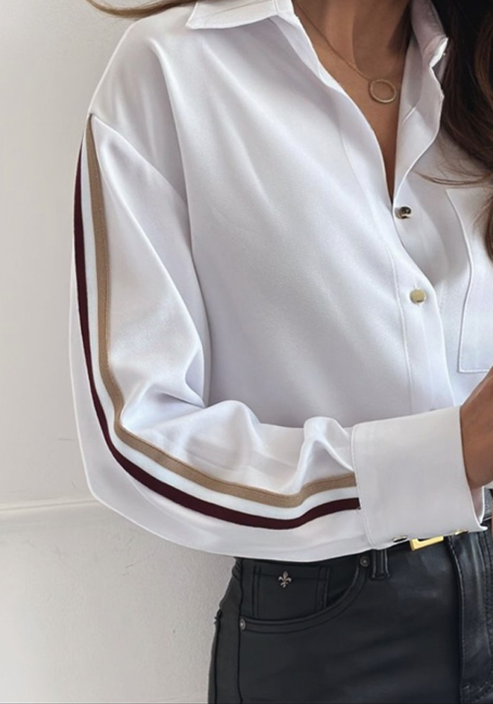 Το λευκό πουκάμισο Stripe με μπορντώ και κάμελ ρίγες στο μανίκι αποτελεί μία μοντέρνα και κομψή επιλογή για καθημερινές αλλά και πιο formal εμφανίσεις. Ο κλασικός γιακάς σε συνδυασμό με το oversized fit προσφέρει άνεση και στιλ, ενώ οι λεπτομέρειες με τις γραμμές στα μανίκια δίνουν αθλητικό και σύγχρονο χαρακτήρα. Ιδανικό για να φορεθεί μέσα από σακάκι, με παντελόνι ή ακόμα και με τζιν για ένα ολοκληρωμένο smart casual look.