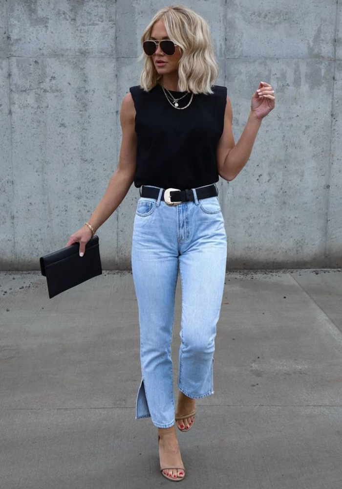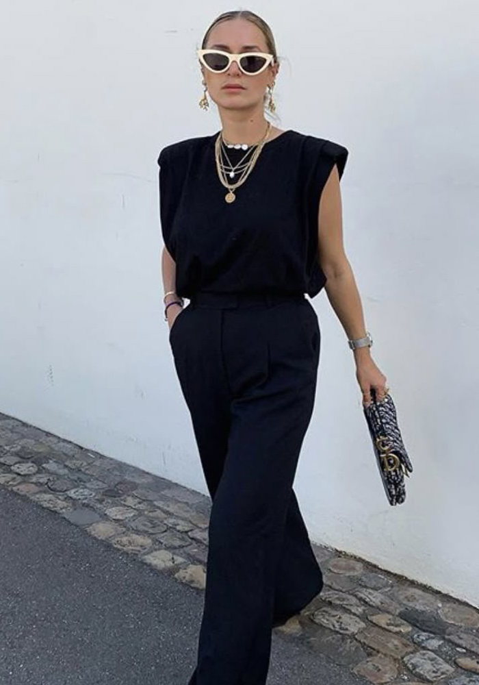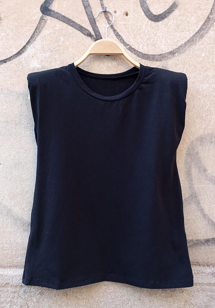 Minimal μαύρο μπλουζάκι με βάτες, ιδανικό για σύγχρονες και κομψές εμφανίσεις. Ο structured σχεδιασμός στους ώμους αναδεικνύει τη σιλουέτα, ενώ η άνετη γραμμή το καθιστά κατάλληλο για καθημερινό styling ή πιο chic συνδυασμούς με παντελόνια και φούστες. Must-have basic για κάθε γκαρνταρόμπα.
