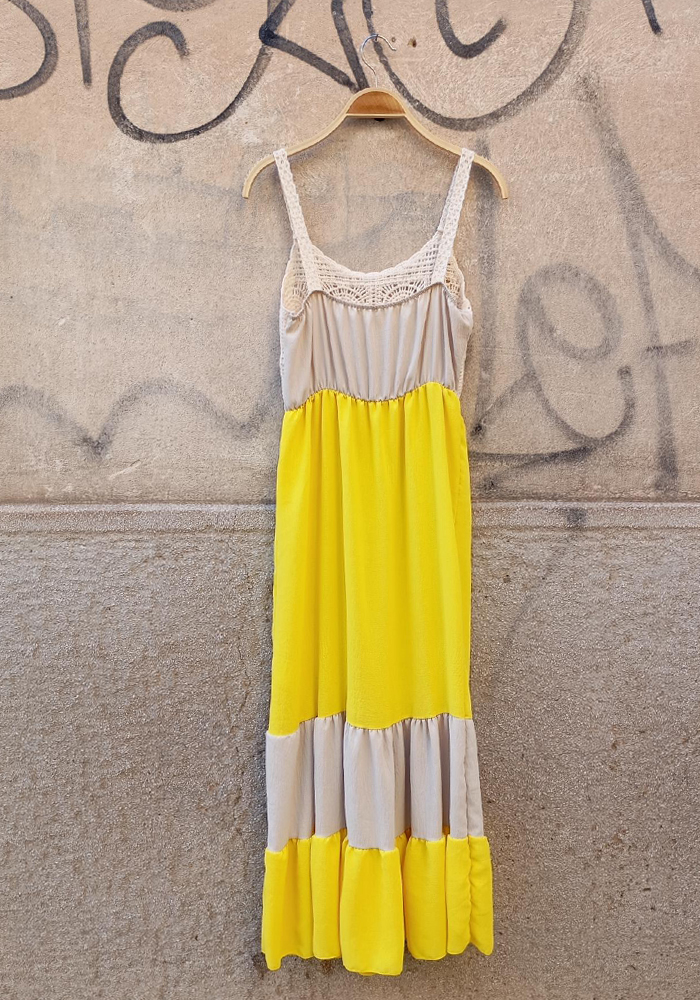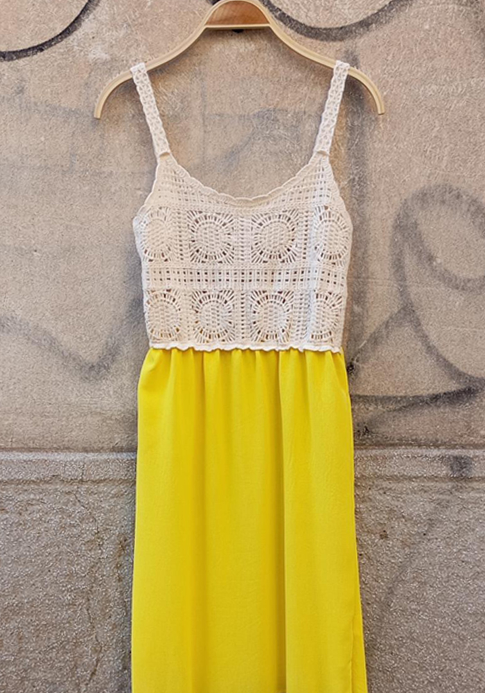 Αναδείξτε τη θηλυκή σας πλευρά με αυτό το maxi αμάνικο φόρεμα με crochet μπούστο. Ο συνδυασμός πλεκτού επάνω μέρους σε natural απόχρωση με πολύχρωμη ριγέ φούστα σε έντονο κίτρινο και εκρού δημιουργεί ένα δροσερό και ανάλαφρο look, ιδανικό για τις καλοκαιρινές σας αποδράσεις. Με άνετη εφαρμογή και αέρινη γραμμή, αποτελεί το απόλυτο boho-chic κομμάτι για την καθημερινότητά σας ή τις διακοπές.