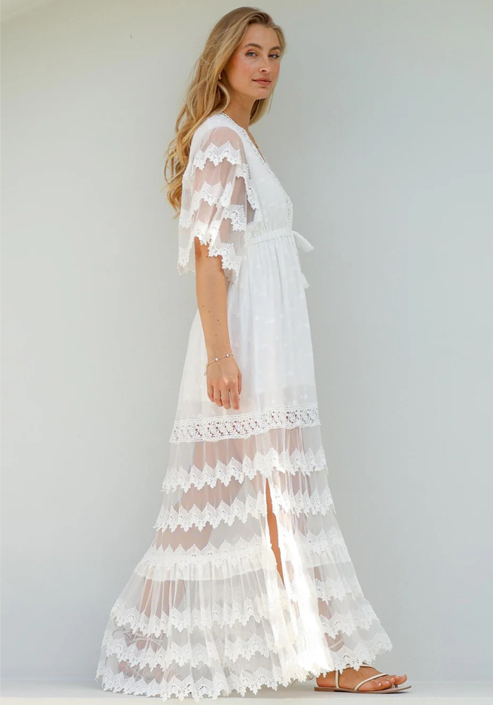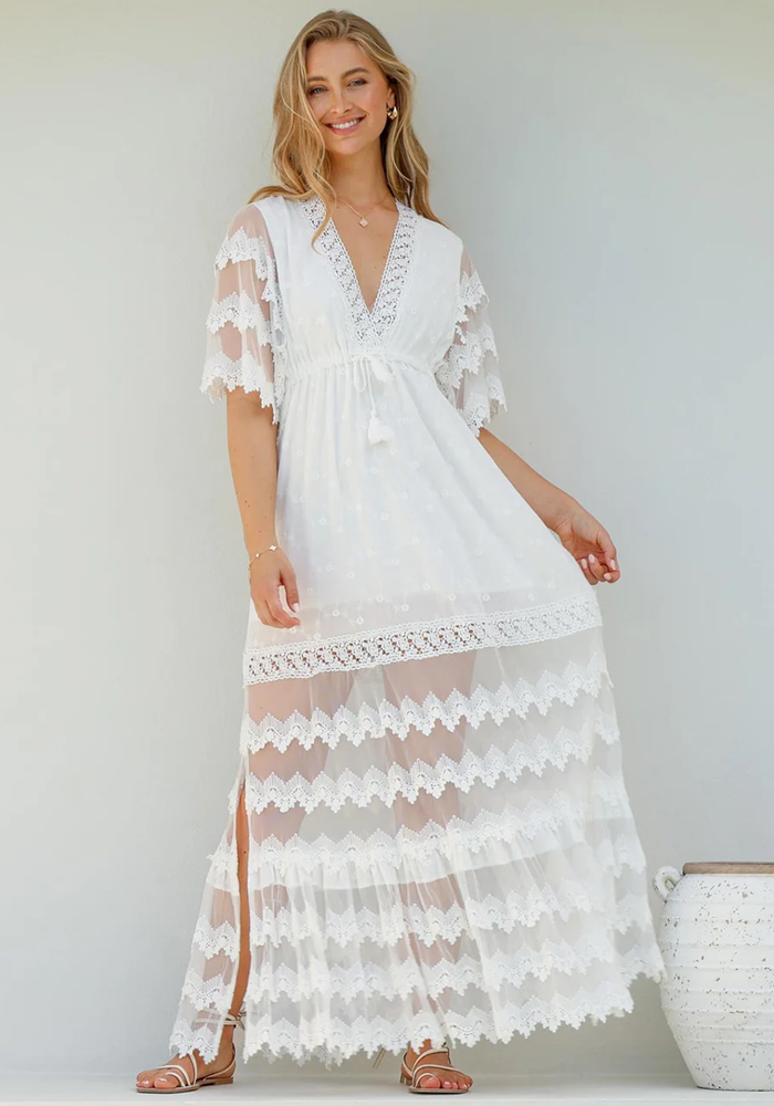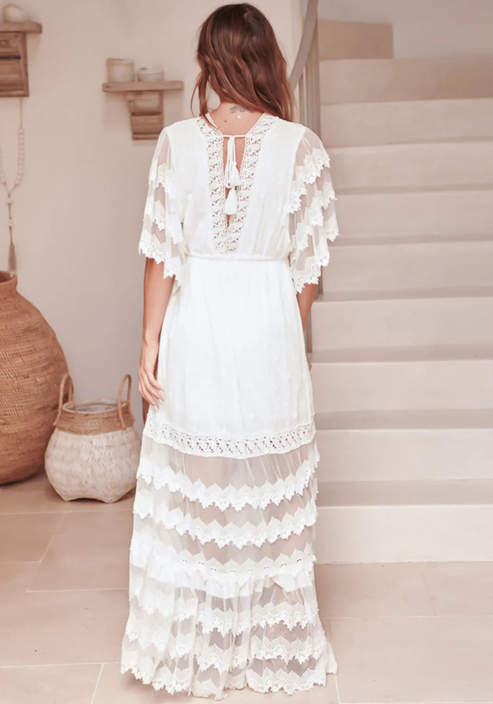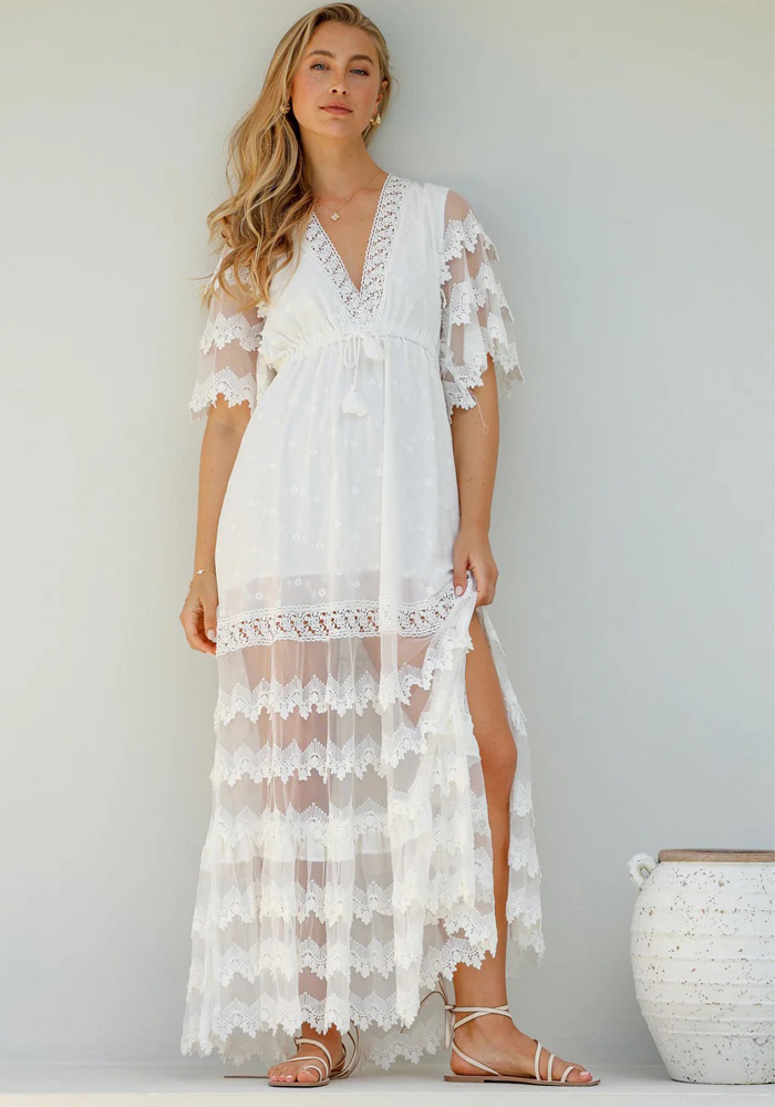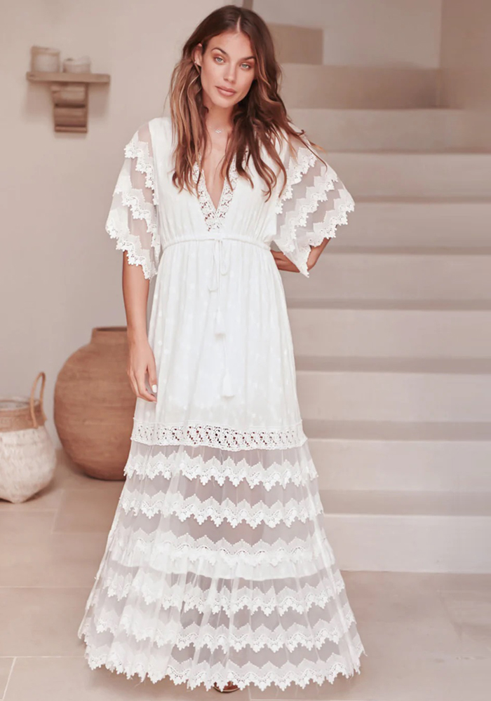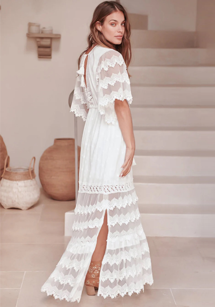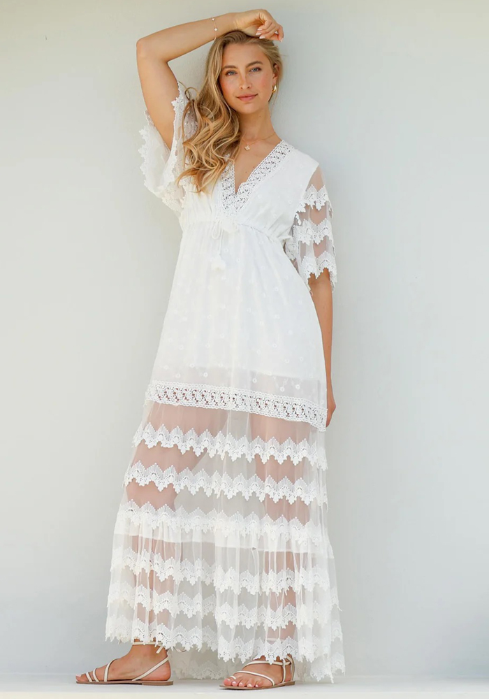 Boho luxe, bridal λευκό φόρεμα σε συνδυασμό high quality gauze cotton με mini floral κέντημα & φάσες crochet δαντέλας, ενωμένες με φίνο τούλι. Είναι σχεδιασμένο σε πατρόν empire, με detailed βαθύ V εμπρός & στην πλάτη, λάστιχο κάτω από το στήθος για τέλειο fitting & κορδόνια. Τα μανίκια είναι 3/4 & γραμμή κλος με ανοίγματα στο πλάϊ. Ιδανικό για beach wedding & luxe romantic style!