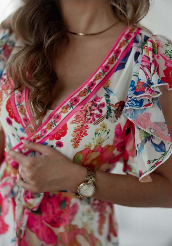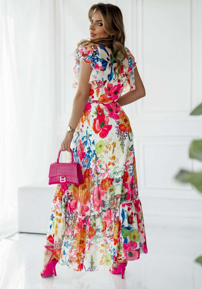 Boho chic, αέρινο φόρεμα από εμπριμέ μουσελίνα με floral print. Είναι σχεδιασμένο σε ανοιχτό πατρόν robe, κρουαζέ και δένει γύρω από το σώμα με ζώνη. Εσωτερικά έχει jersey μισοφόρι. Στους ώμους έχει frills & high low ασύμμετρο σχήμα. Τέλειο με sandals για καλεσμένη σε Γάμο ή Βάπτιση!