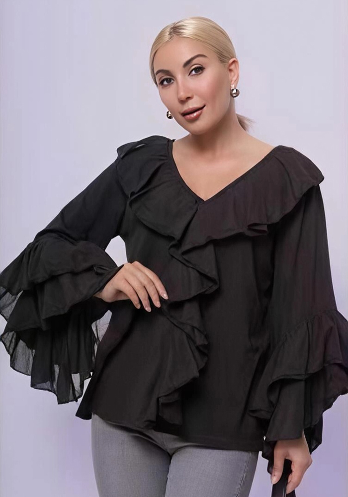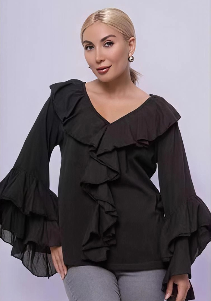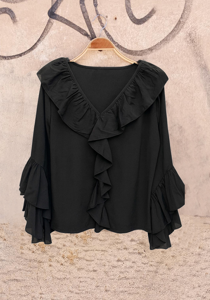 Ανακαλύψτε την κομψότητα με αυτή τη μαύρη μπλούζα με βολάν, σχεδιασμένη για γυναίκες που αγαπούν το διαχρονικό στυλ με μια δόση θηλυκότητας. Οι εντυπωσιακές μανσέτες και το ντεκολτέ με βολάν προσδίδουν κίνηση και ρομαντισμό, ενώ η άνετη γραμμή της την καθιστά ιδανική τόσο για καθημερινές εμφανίσεις όσο και για βραδινές εξόδους. Συνδυάστε την με παντελόνι ή φούστα για ένα ολοκληρωμένο, σοφιστικέ look.