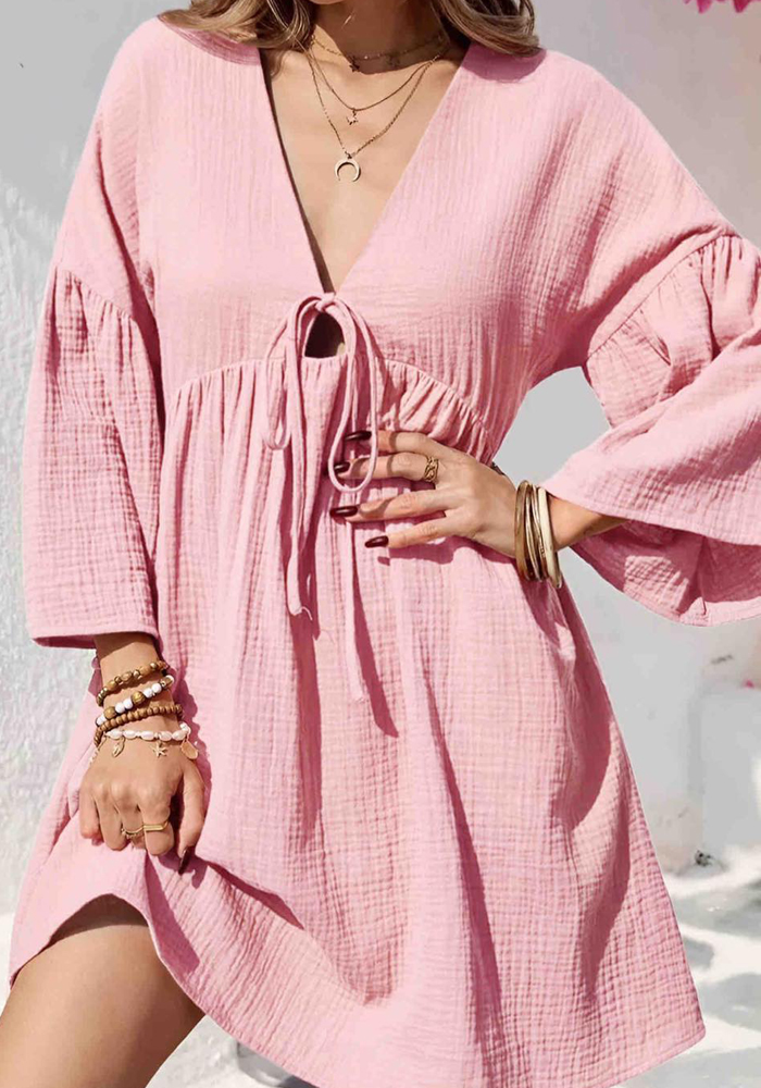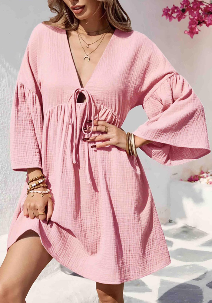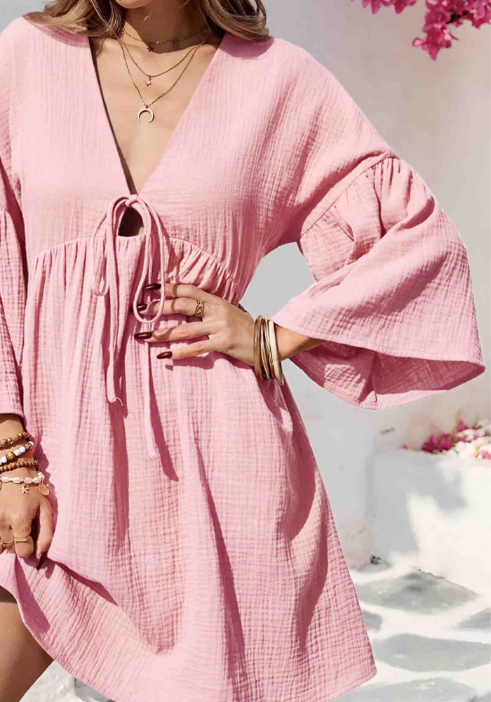 Boho φόρεμα από 100% βαμβακερό ανάλαφρο ύφασμα. Είναι σχεδιασμένο σε άνετη, χαλαρή γραμμή, με 3/4 καμπάνα μανίκια και V με άνοιγμα και δέσιμο στο στήθος. Τέλειο φόρεμα για διακοπές!