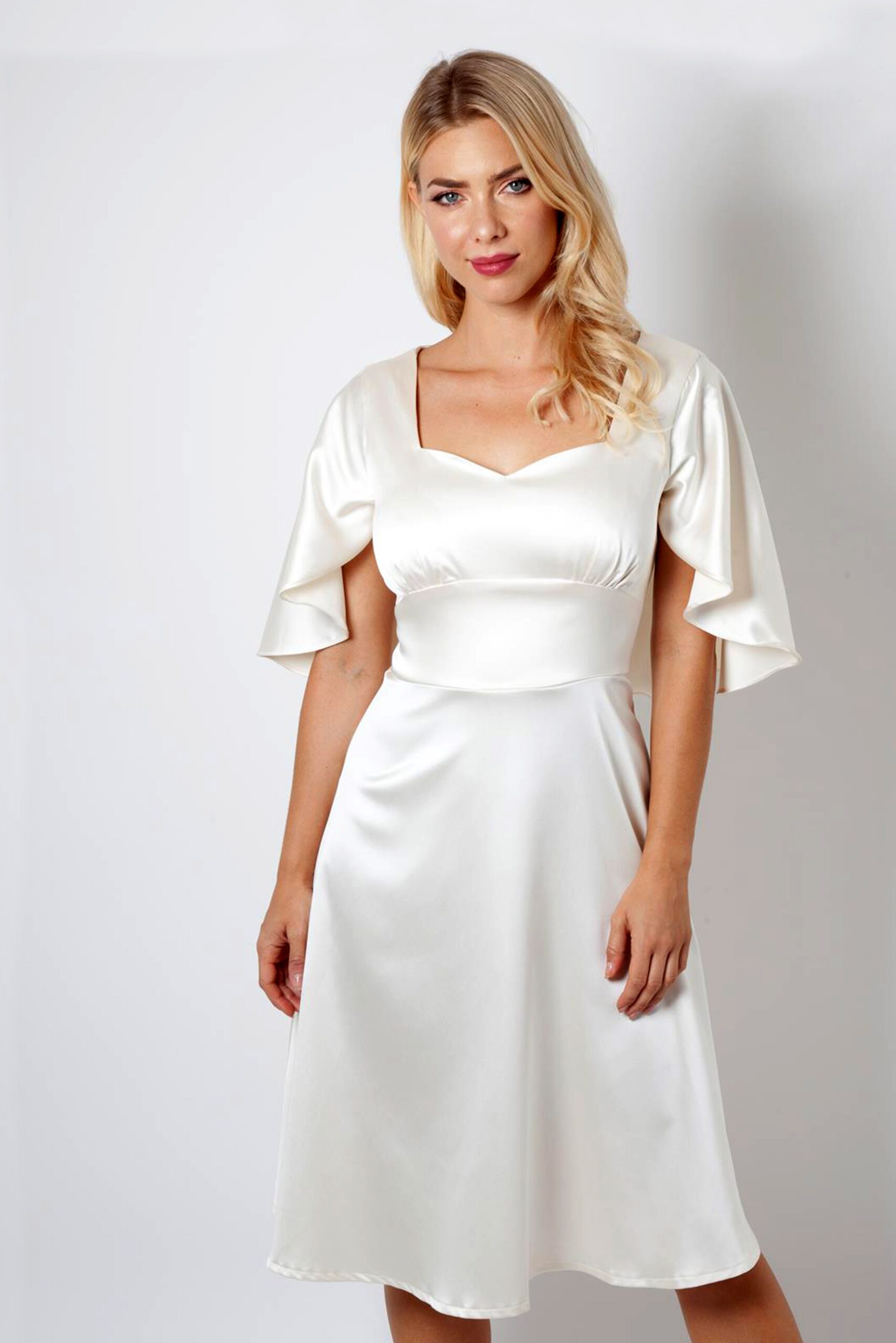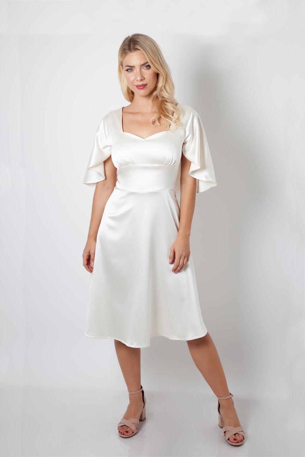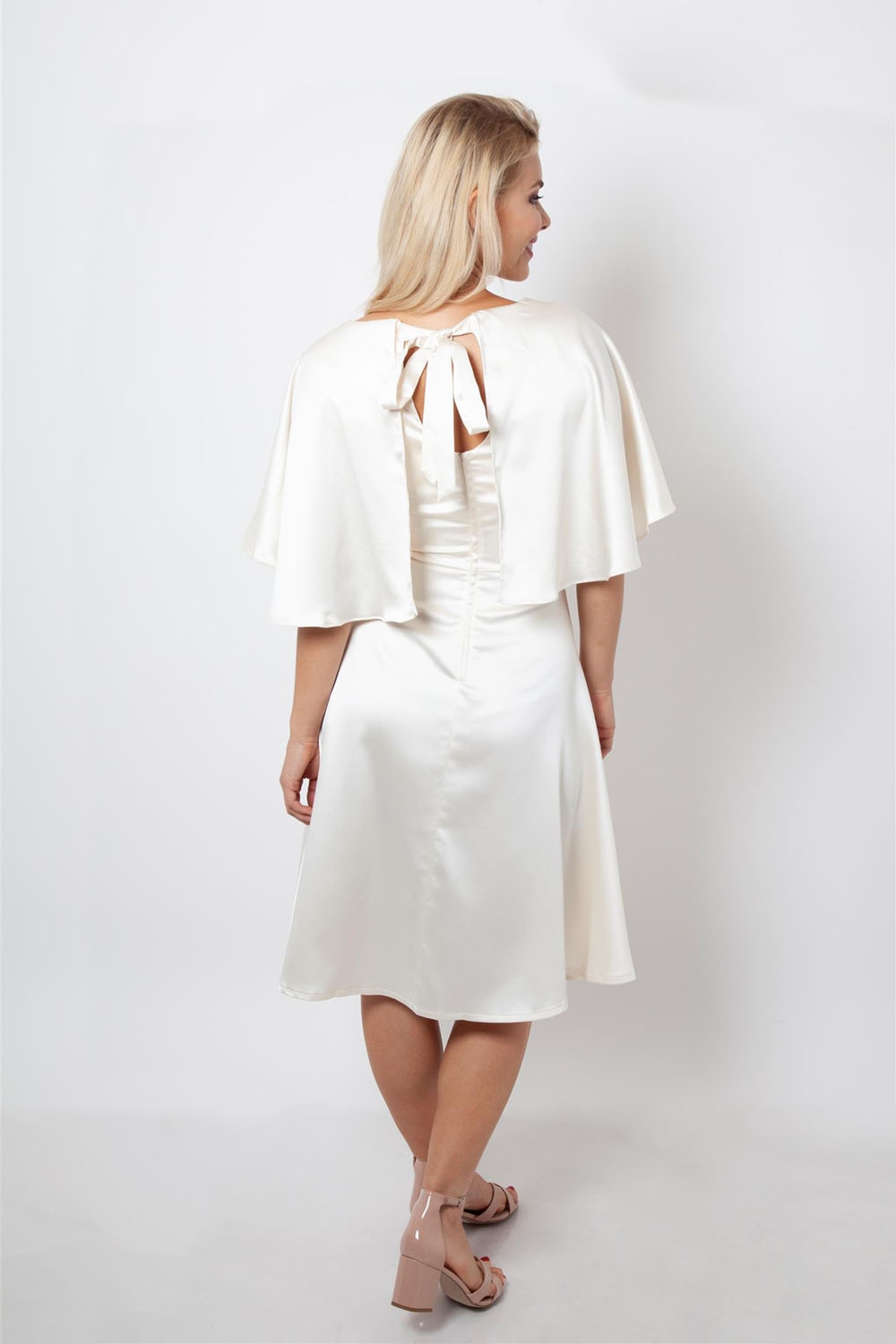 Romantic, vintage styled bridal φόρεμα από εκρού medium shine σατέν. Είναι σχεδιασμένο με ντεκολτέ Queen Anne, μανίκια cape που δένουν με φάσα στην πλάτη, εφαρμοστή μέση & flute, κλος γραμμή κάτω από το γόνατο. Chic για retro brides!