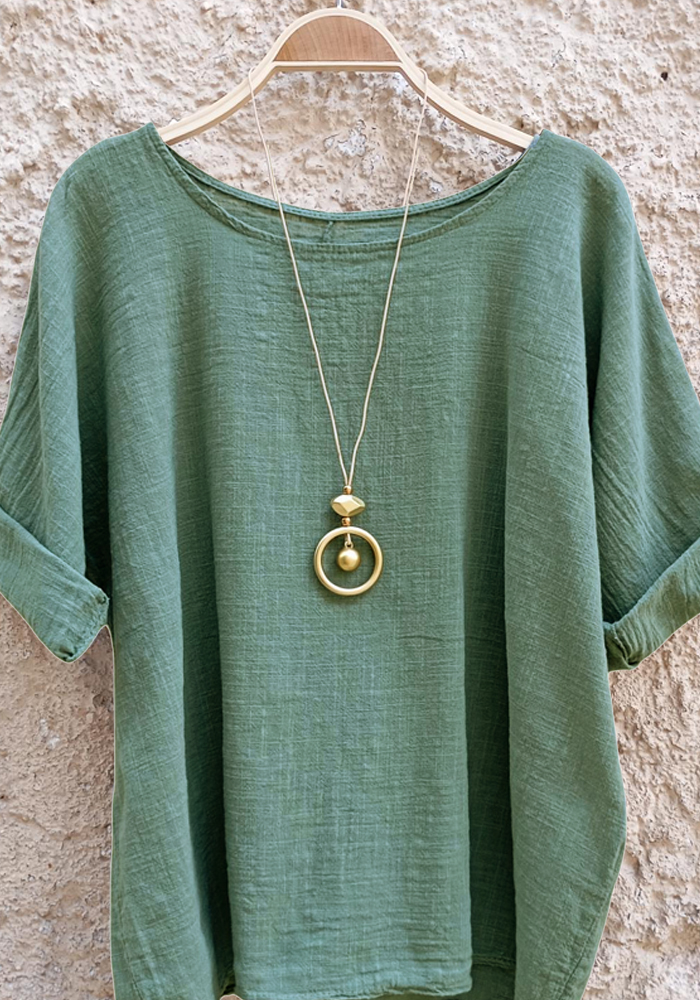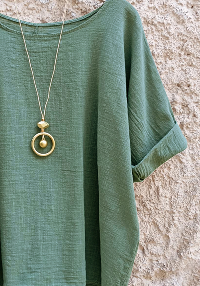 Η oversized μπλούζα Toscana είναι σχεδιασμένη για γυναίκες που εκτιμούν την άνεση χωρίς να κάνουν συμβιβασμούς στο στυλ. Με χαλαρή γραμμή, στρογγυλή λαιμόκοψη και μανίκια με ρεβέρ, αποτελεί ιδανική επιλογή για καθημερινές εμφανίσεις, συνδυάζοντας ευκολία στην εφαρμογή και καθαρή, μοντέρνα αισθητική.