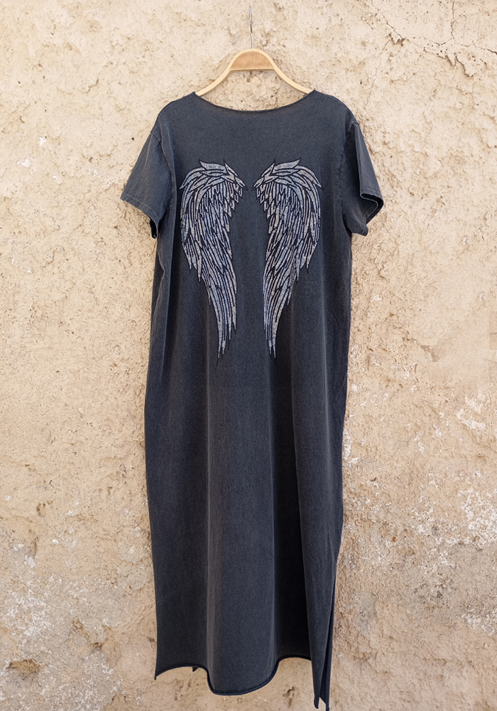 Minimal και ταυτόχρονα εντυπωσιακό, αυτό το γκρι midi φόρεμα με V λαιμόκοψη και κοντό μανίκι συνδυάζει άνεση και στυλ. Το ύφασμα του είναι μαλακό πετροπλυμένο βαμβακερό με μικρή ελαστικότητα . Η εντυπωσιακή λεπτομέρεια με φτερά στην πλάτη χαρίζει μοντέρνο, streetwear χαρακτήρα. Η ίσια γραμμή και το διακριτικό άνοιγμα στο πλάι εξασφαλίζουν ευελιξία στις κινήσεις, καθιστώντας το ιδανική επιλογή για όλες τις ώρες της ημέρας.
