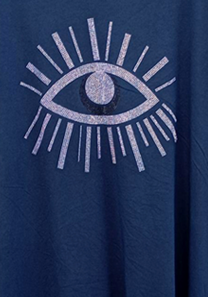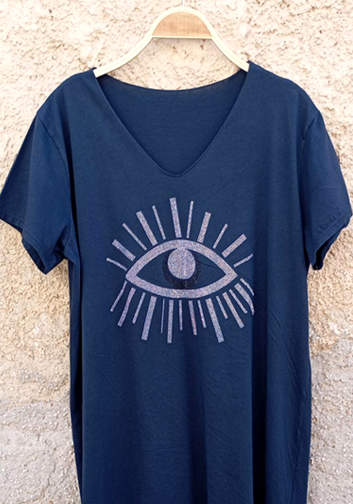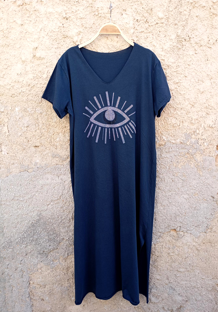 Μακρύ γυναικείο φόρεμα σε σκούρο μπλε χρώμα, με V λαιμόκοψη και εντυπωσιακό τύπωμα «μάτι» με λαμπερές λεπτομέρειες στο μπροστινό μέρος. Το ύφασμα του είναι μαλακό πετροπλυμένο βαμβακερό με μικρή ελαστικότητα. Χαλαρή γραμμή για άνετη εφαρμογή, ιδανικό για καθημερινές casual chic εμφανίσεις