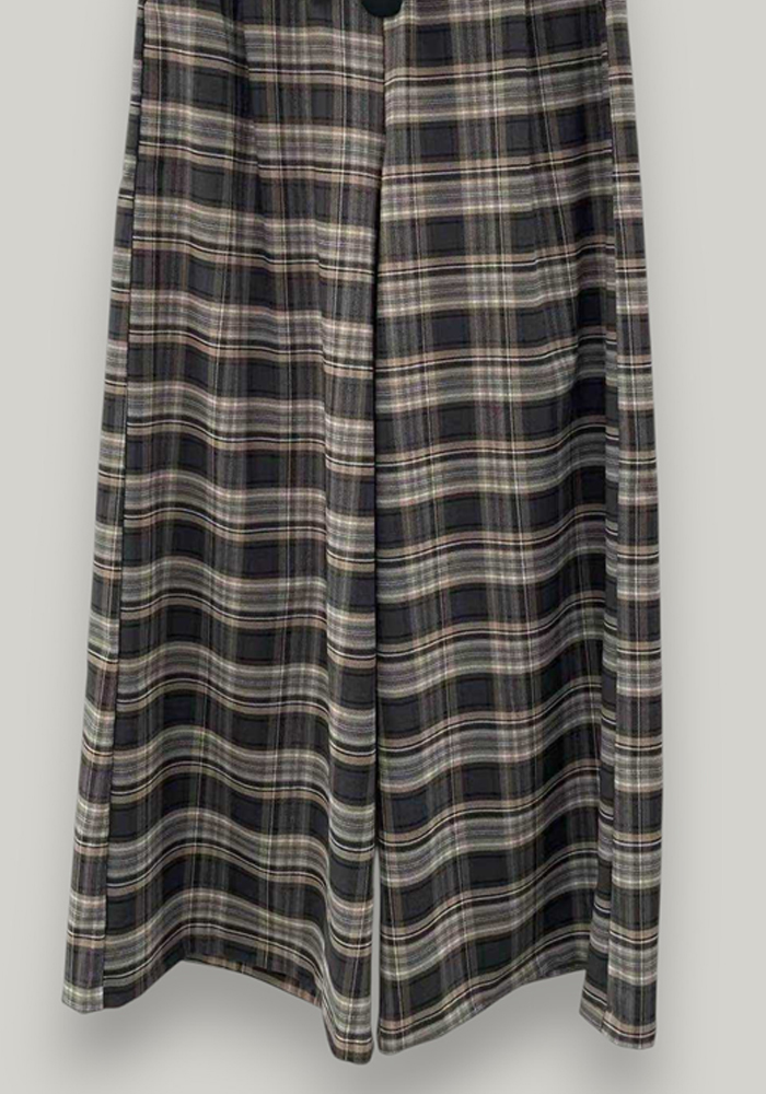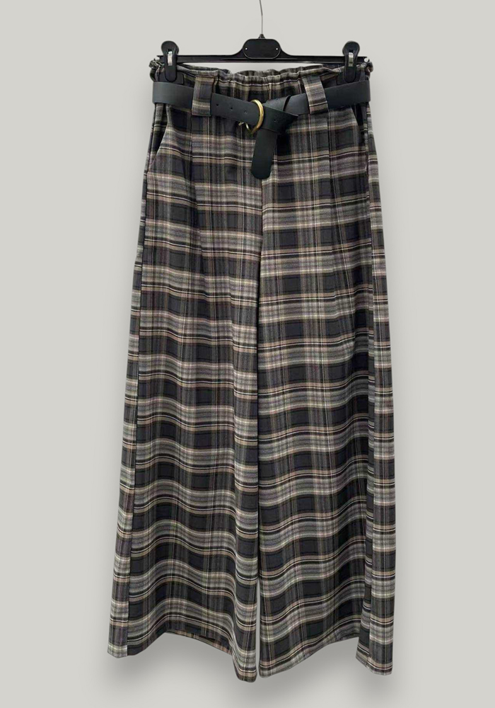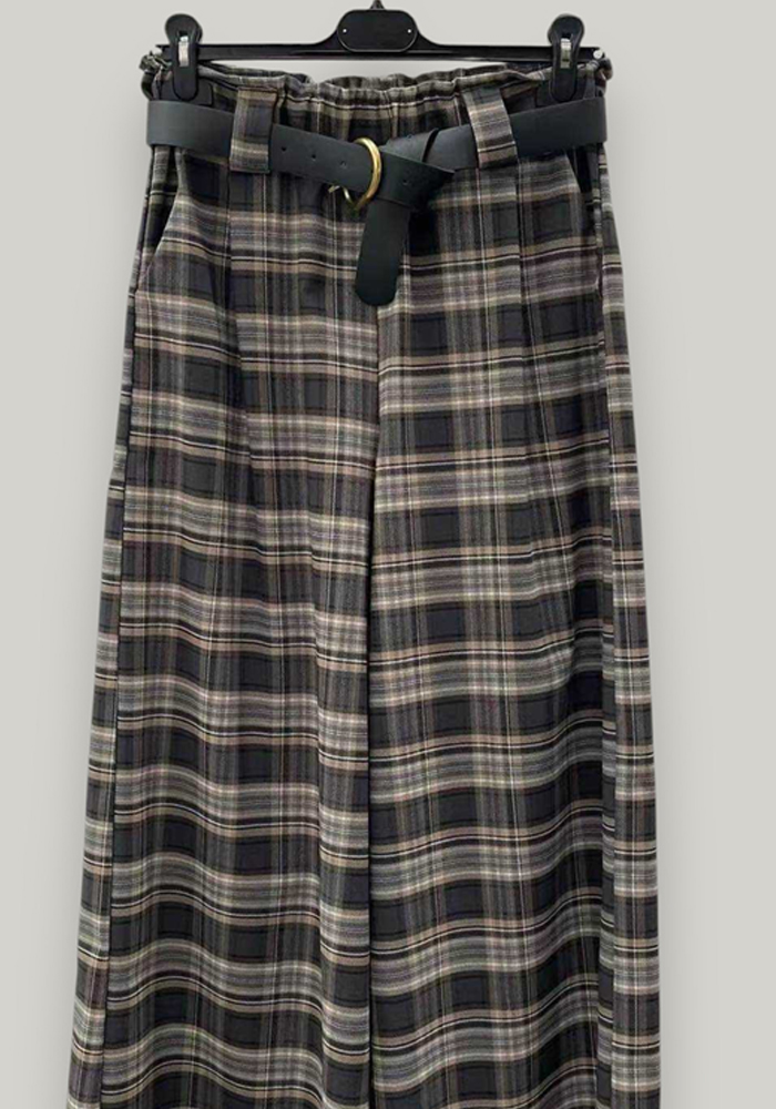 Γυναικείο παντελόνι palazzo σε καρό μοτίβο, ιδανικό για κομψές και άνετες εμφανίσεις. Διαθέτει ψηλή μέση με λάστιχο πίσω για καλύτερη εφαρμογή, αποσπώμενη ζώνη σε μαύρο χρώμα και φαρδιά γραμμή που χαρίζει κίνηση και στυλ. Ιδανικό για επαγγελματικό look, αλλά και για σικ casual outfits.