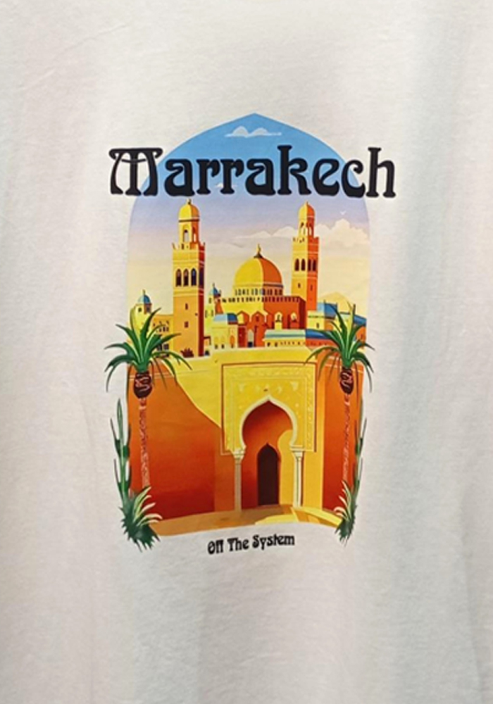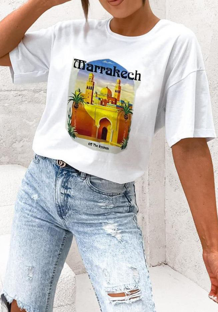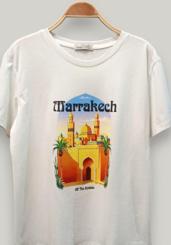 Casual chic t-shirt από βαμβακερό ύφασμα με στάμπα “Marrakech”. Είναι σχεδιασμένο σε άνετη γραμμή και μπορεί να καλύψει έως και large νούμερο. Τέλειο για casual & chic outfit!