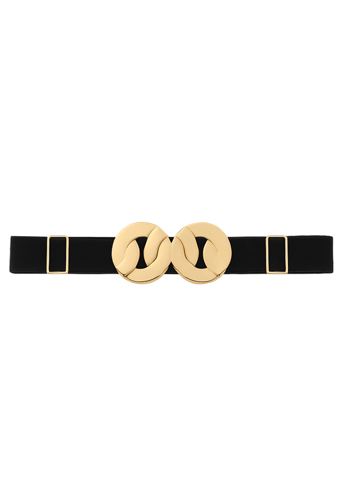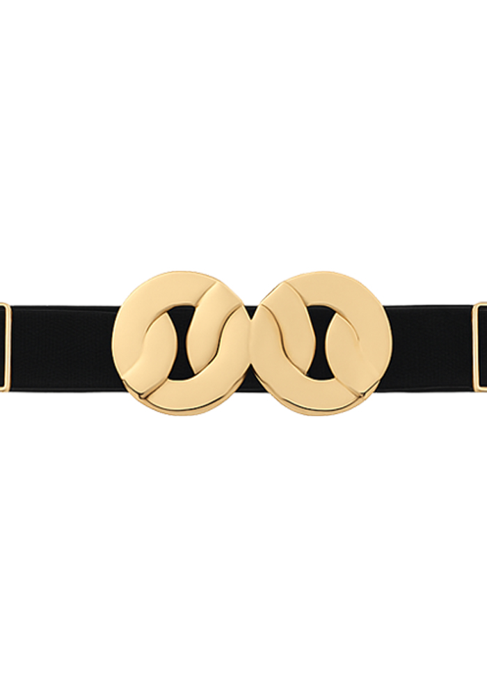 Αναβαθμίστε την εμφάνισή σας με αυτή τη μοντέρνα και κομψή ζώνη σε μαύρη βάση με μεταλλική χρυσή αγκράφα διπλού κρίκου. Ο ελαστικός ιμάντας προσφέρει άνεση και σταθερότητα, ενώ η διακοσμητική αγκράφα σε σχήμα «διπλού κύκλου» προσθέτει ένα luxury στοιχείο που τραβά τα βλέμματα. Ιδανική για styling με φορέματα, oversized πουκάμισα και σακάκια, δίνει έμφαση στη μέση και αναδεικνύει τη σιλουέτα.