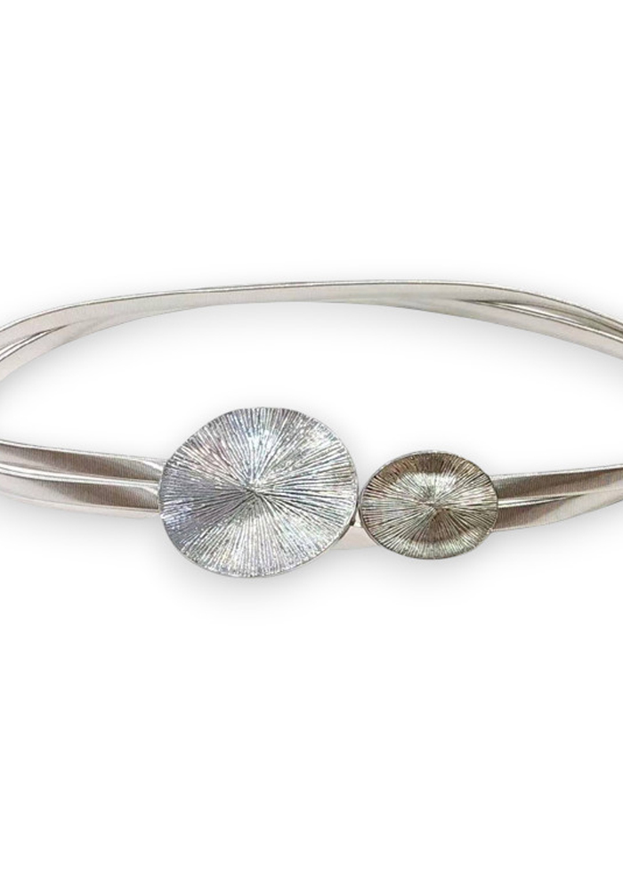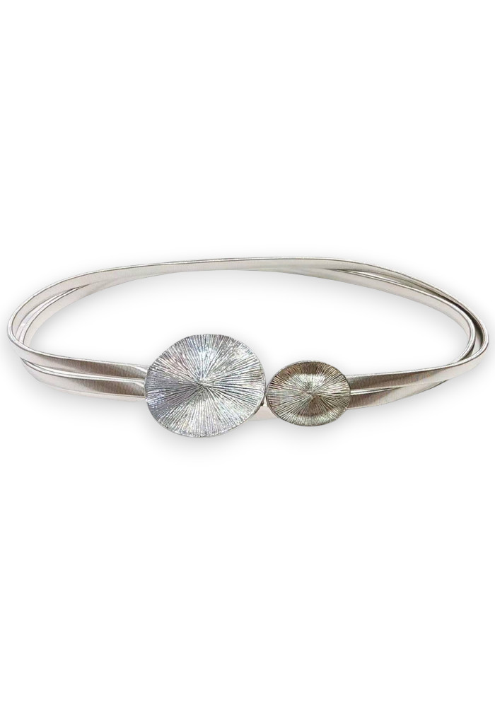 Κομψή μεταλλική ζώνη σε ασημί χρώμα με διπλή λωρίδα και εντυπωσιακή αγκράφα σε σχέδιο δύο ανάγλυφων κύκλων. Προσδίδει πολυτελή πινελιά σε φορέματα, πουκάμισα ή παντελόνια και αναβαθμίζει άμεσα κάθε εμφάνιση.