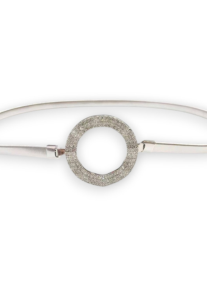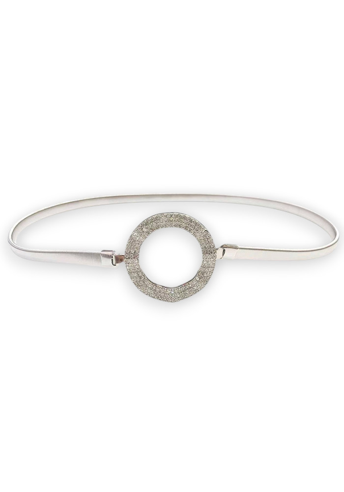 Γυναικεία ελαστική ζώνη σε ασημί απόχρωση με κυκλική αγκράφα διακοσμημένη με λαμπερά στρας. Ιδανική για να τονίζει τη μέση και να αναβαθμίζει κάθε σύνολο, από κοκτέιλ φορέματα μέχρι chic καθημερινές εμφανίσεις.