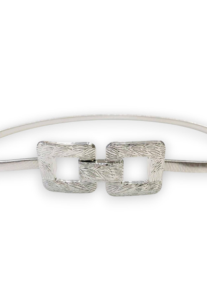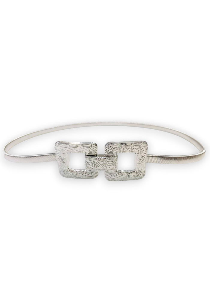 Ελαστική γυναικεία ζώνη σε ασημί απόχρωση με εντυπωσιακή αγκράφα διπλού τετραγώνου. Κομψός, minimal σχεδιασμός που αναδεικνύει τη μέση και ολοκληρώνει κάθε formal ή casual chic σύνολο.