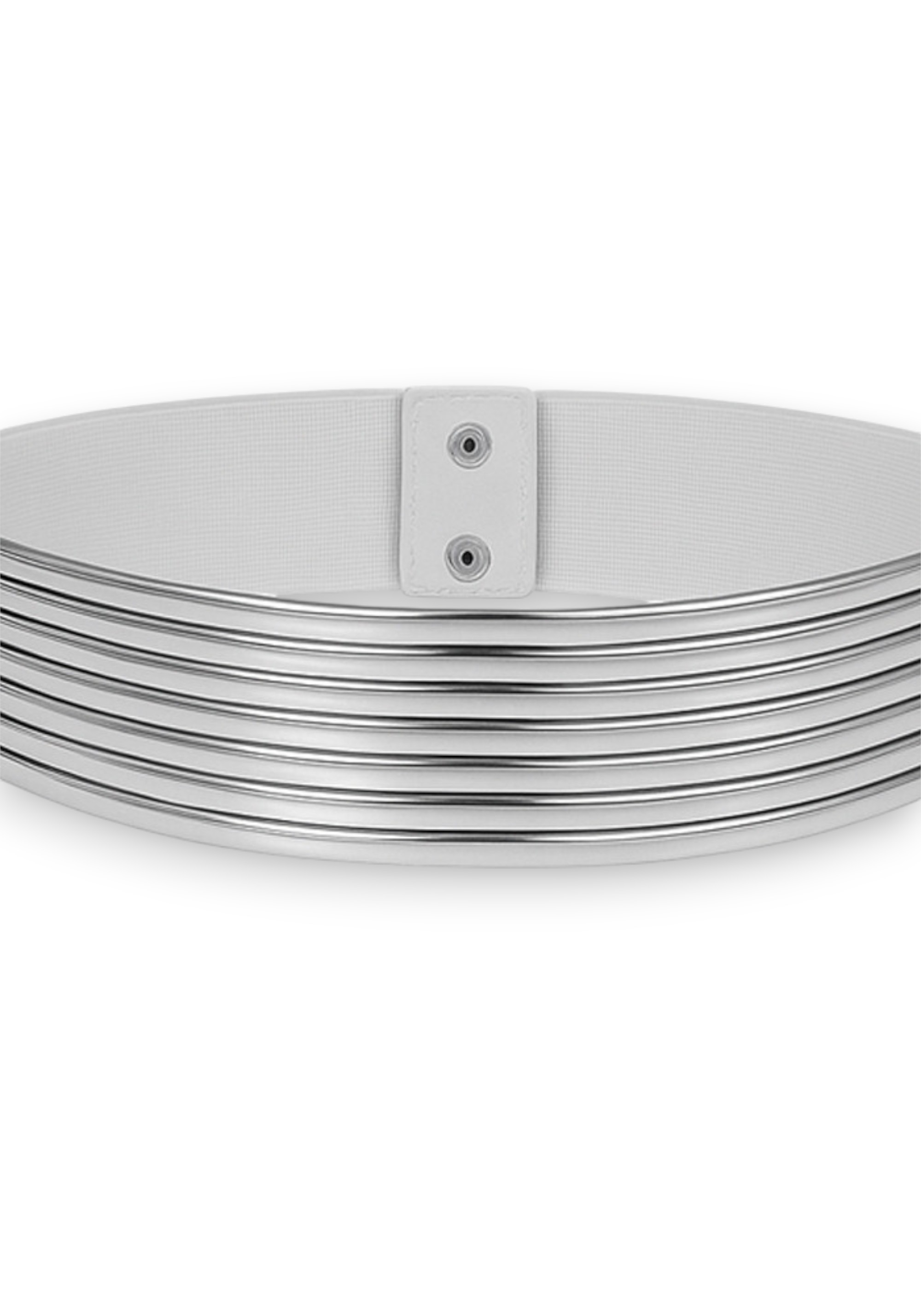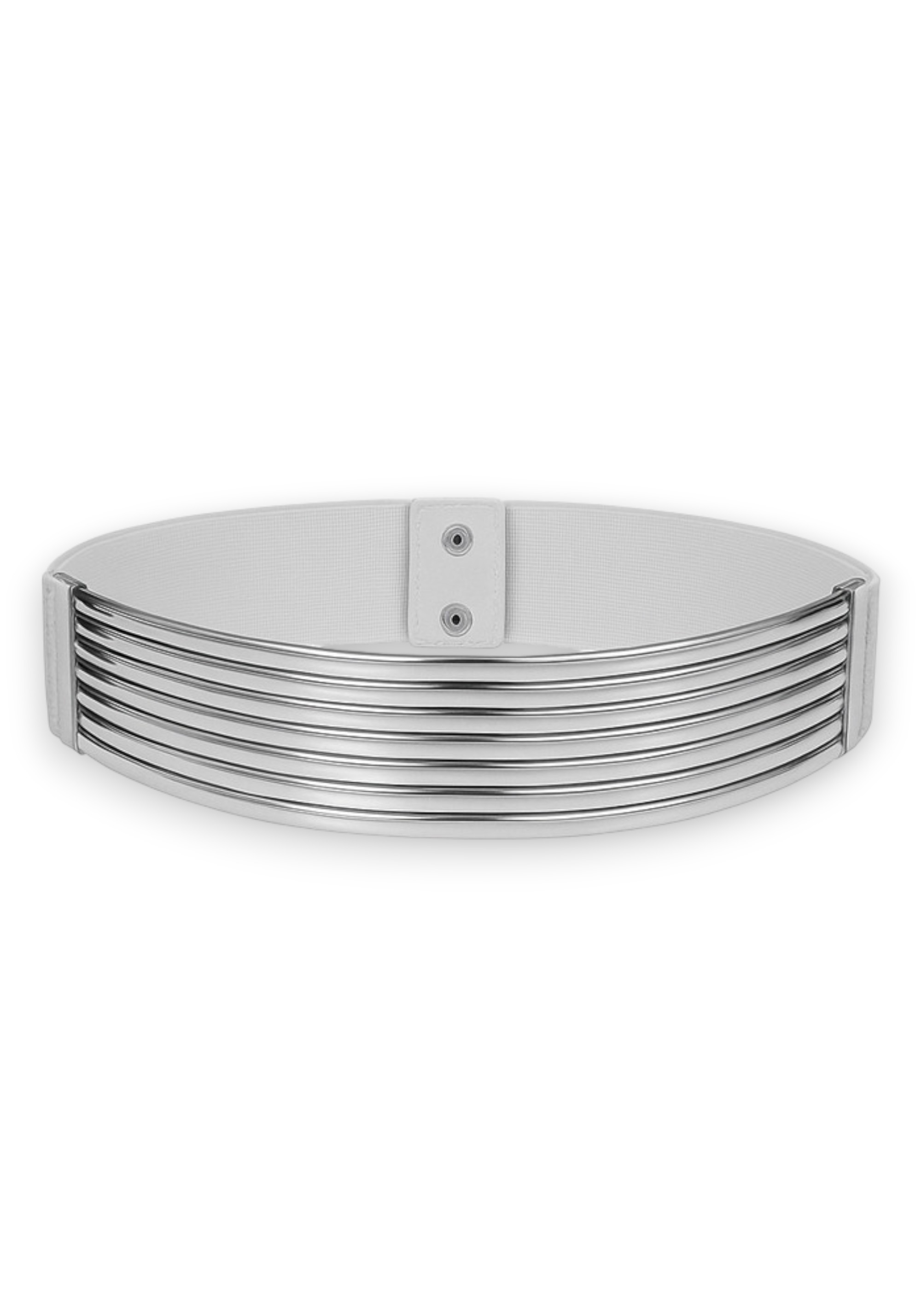 Statement ελαστική ζώνη με μεταλλικό εφέ εμπρός σε ριγέ σχεδιασμό και glossy ασημί απόχρωση. Το λάστιχο πίσω προσαρμόζεται άνετα στη μέση, ενώ το διπλό κούμπωμα εξασφαλίζει σταθερότητα. Φόρεσε την με φορέματα, σακάκια ή πουκάμισα και δώσε μοντέρνο, δυναμικό στυλ σε κάθε σου εμφάνιση.