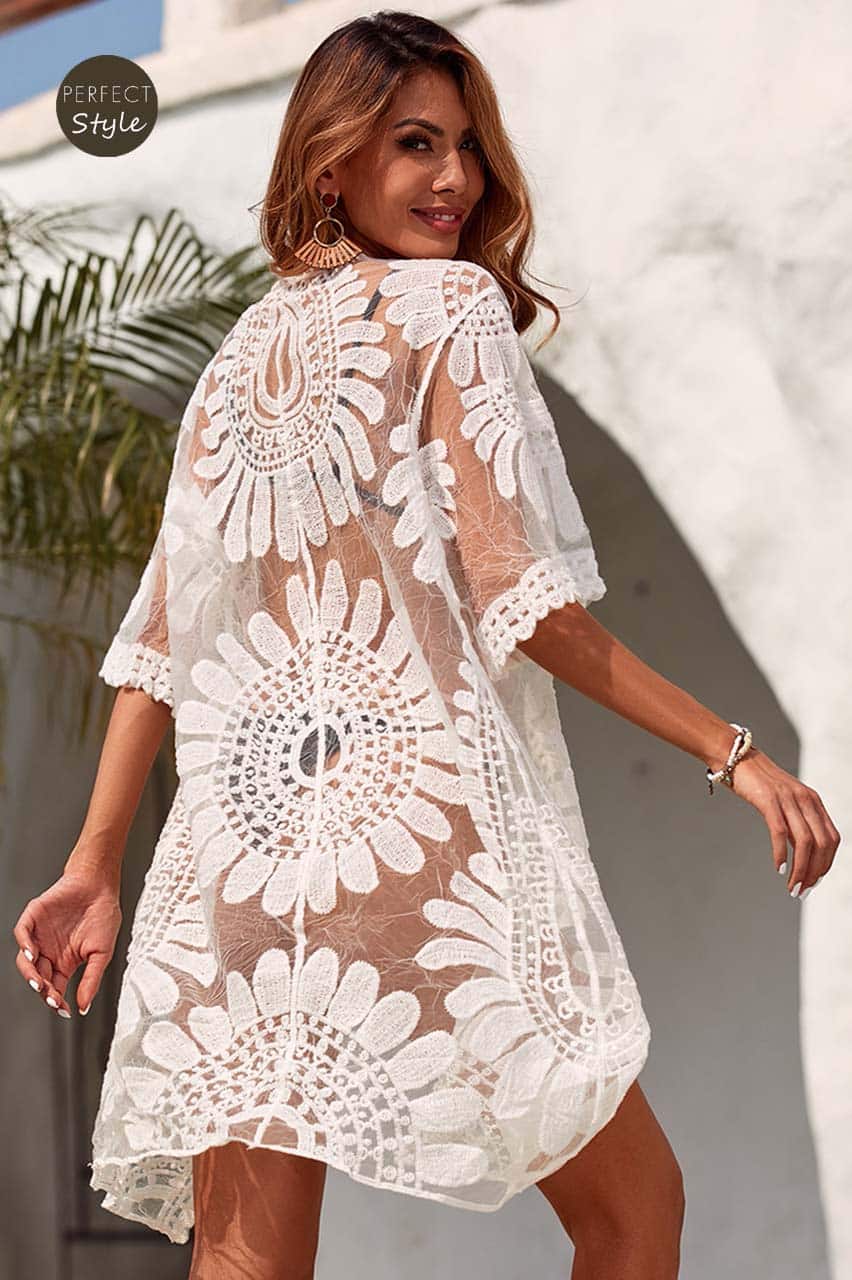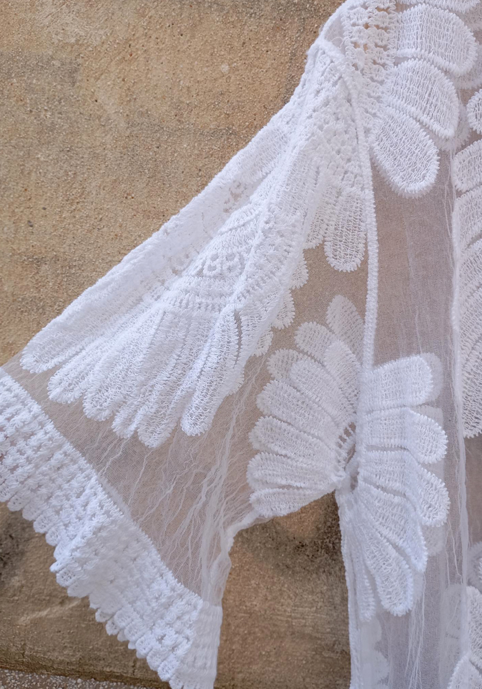 Ethnic chic kimono από tulle διαφάνεια με floral, cotton απλικέ σε απόχρωση off white. Έχει τελειώματα δαντέλας & κλείνει με crochet κορδόνι εμπρός. Συνδυάζεται με πολλούς τρόπους ανάλογα το occasion!