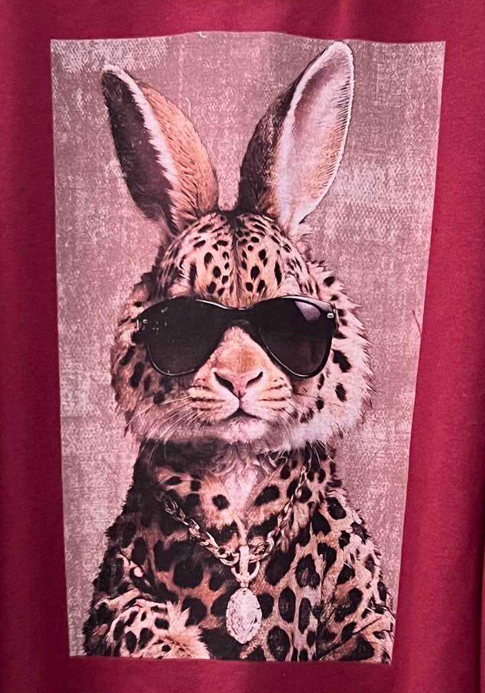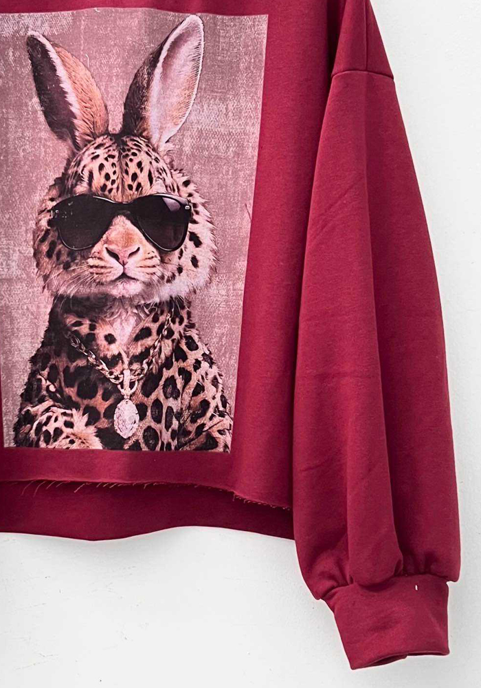 Oversized γυναικείο μπορντώ φούτερ με μοναδικό animal print σχέδιο “Luxe Bunny” σε μπροστινή στάμπα Διαθέτει στρογγυλή λαιμόκοψη, μακριά μανίκια με λάστιχο και τελείωμα με ακατέργαστο κόψιμο για μοντέρνο streetwear στυλ. Ιδανικό για καθημερινές εμφανίσεις με fashion twist.
