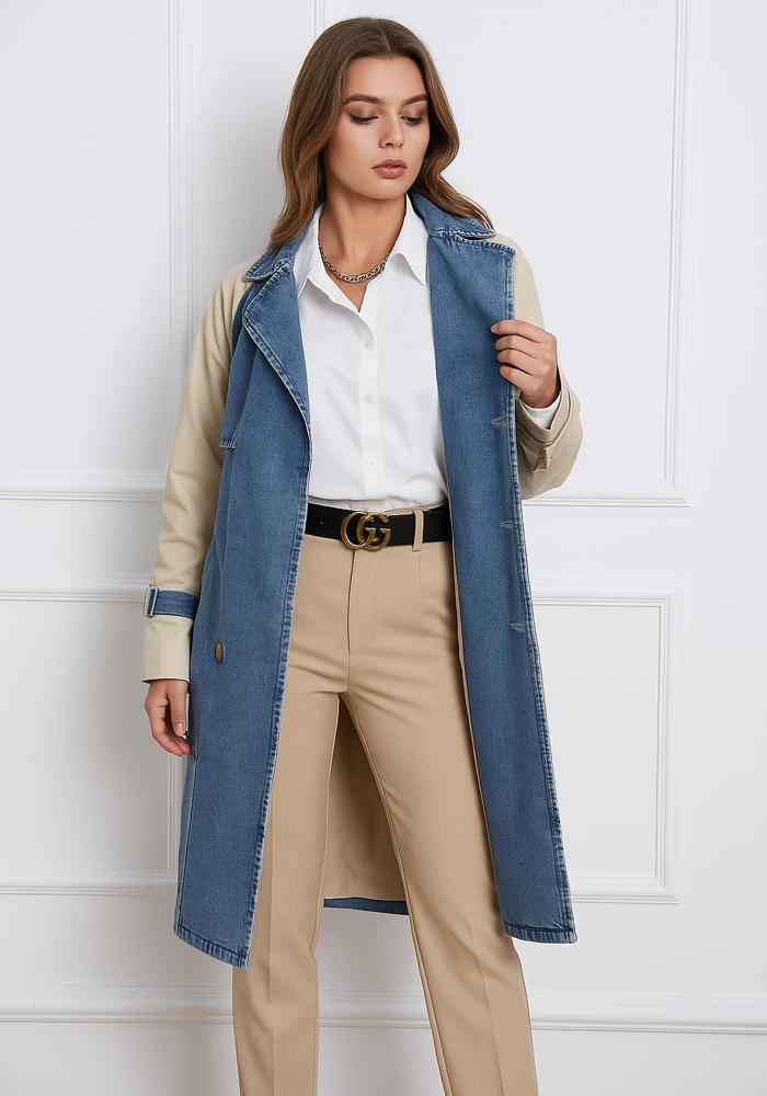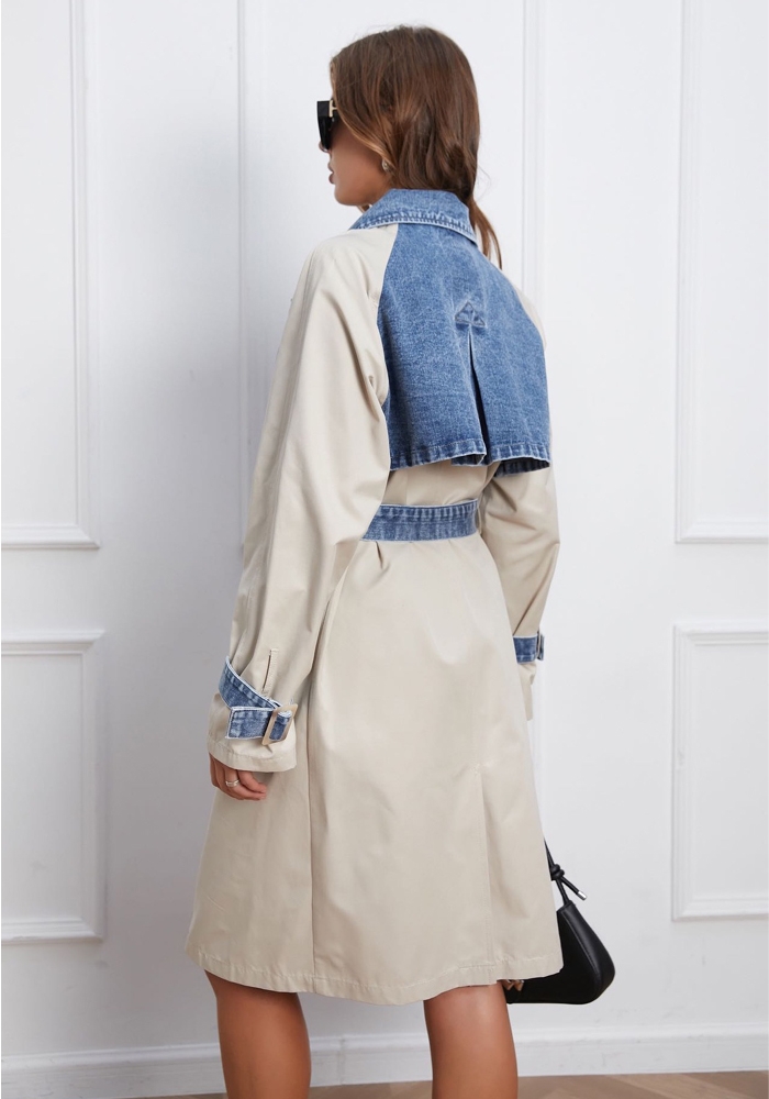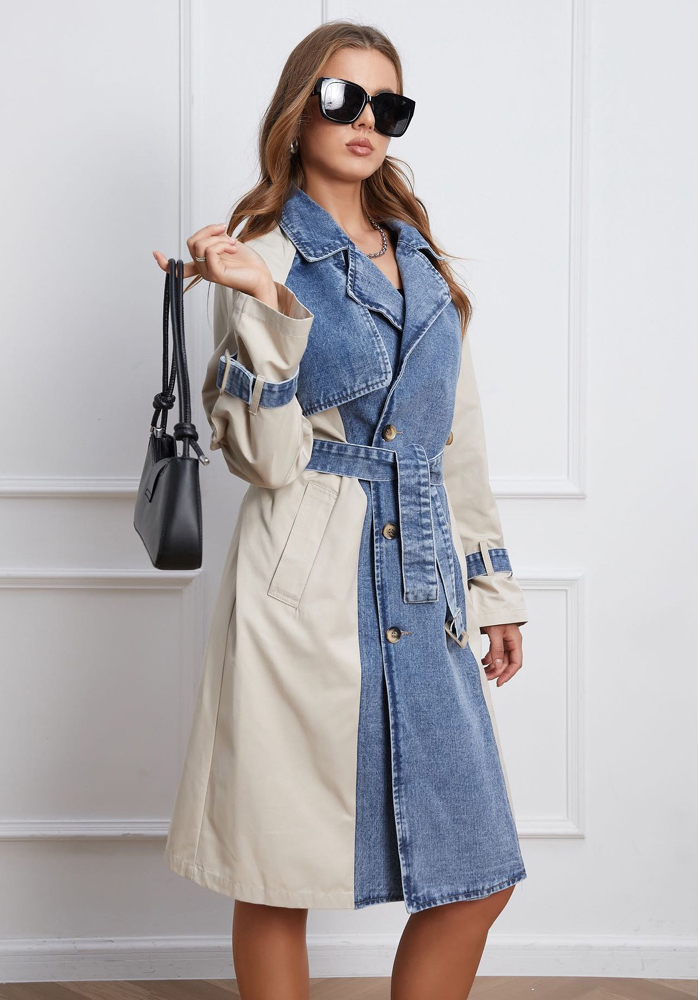 Ανανεώστε το στυλ σας με το μοντέρνο trench coat με denim λεπτομέρειες. Ο συνδυασμός κλασικού μπεζ υφάσματος με τζιν δημιουργεί ένα μοναδικό statement κομμάτι που απογειώνει κάθε εμφάνιση. Διαθέτει ζώνη στη μέση για εφαρμογή που κολακεύει, κουμπιά σε όλο το μήκος και denim γιακά και μανσέτες, δίνοντας μια κομψή αλλά και urban chic αισθητική. Ένα πανωφόρι που συνδυάζει άνεση, ποιότητα και στυλ, ιδανικό για all-day looks.