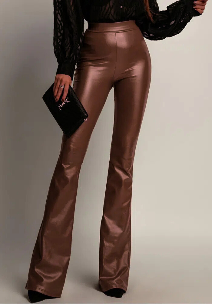 Παντελόνι καμπάνα από ύφασμα λακέ. Είναι σχεδιασμένο σε υψηλόμεσο, εφαρμοστό πατρόν με φαρδύ λάστιχο στη μέση και καμπάνα από το γόνατο και κάτω. Τέλειο για casual αλλά και βραδινά look!