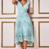 Επίσημο, chic φόρεμα από κεντημένο τούλι δαντέλα με detailed στρίφωμα. Το επάνω τμήμα είναι σε κρουαζέ με πιέτες, σατέν φάσα στη μέση , ενώ το κάτω τμήμα σε ελαφρά ασύμμετρη γραμμή κλος, πλήρως φοδραρισμένο με jersey. Ιδανικό φόρεμα για Γάμο & Βάπτιση!