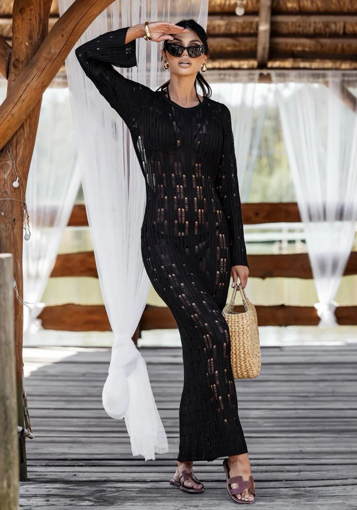 Αναδείξτε την κομψότητα και τη θηλυκότητα σας με αυτό το μαύρο, μακρύ, πλεκτό φόρεμα παραλίας. Σχεδιασμένο με ανοιχτή πλάτη και διαφάνεια που αγκαλιάζει το σώμα, αποτελεί την ιδανική επιλογή για κομψές εμφανίσεις πάνω από το μαγιό σας ή σε resort looks. Διαθέτει μακριά μανίκια, στρογγυλή λαιμόκοψη και ανάλαφρη πλέξη που επιτρέπει στο φως να δημιουργεί ένα εντυπωσιακό παιχνίδι με τις σιλουέτες. Ιδανικό για διακοπές, beach parties και καλοκαιρινές αποδράσεις με στυλ.