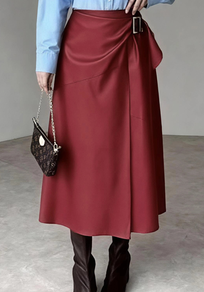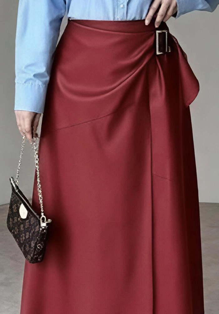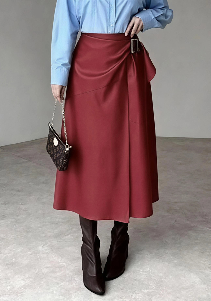 Η γυναικεία maxi wrap φούστα σε μπορντώ χρώμα με αγκράφα αποτελεί μια κομψή και διαχρονική επιλογή για επαγγελματικό και καθημερινό look. Η minimal γραμμή της αγκαλιάζει απαλά τη σιλουέτα, ενώ η αγκράφα προσθέτει διακριτική πολυτέλεια και προσαρμοστικότητα στη μέση. Ιδανική για γραφείο ή after-work εμφανίσεις, συνδυάζεται εύκολα με πουκάμισα και μπότες για ολοκληρωμένο chic outfit.