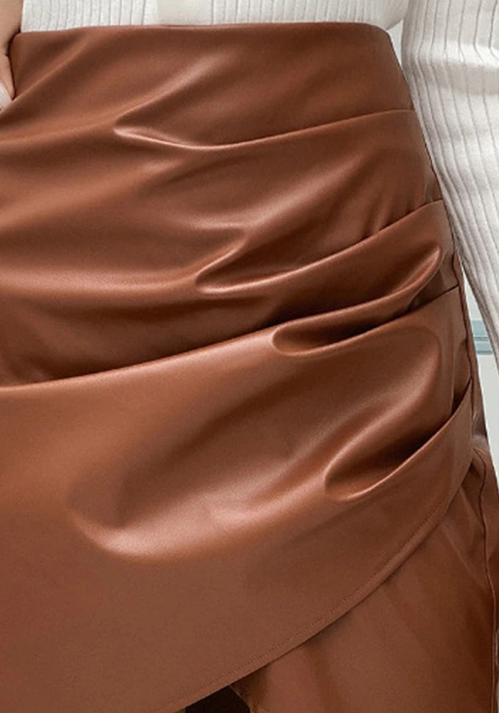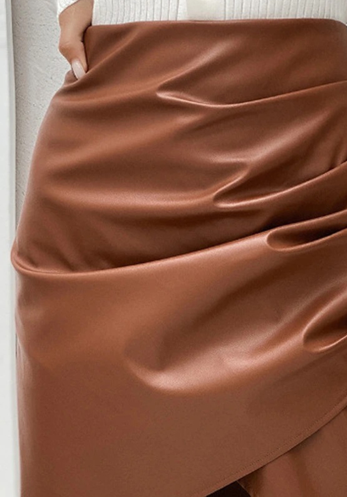 Sexy mini φούστα από faux δέρμα με ματ finish. Είναι σχεδιασμένη με υψηλόμεσο πατρόν & ντραπέ σχέδιο στο πλάι. Τέλειο με satin tops & πλεκτά!