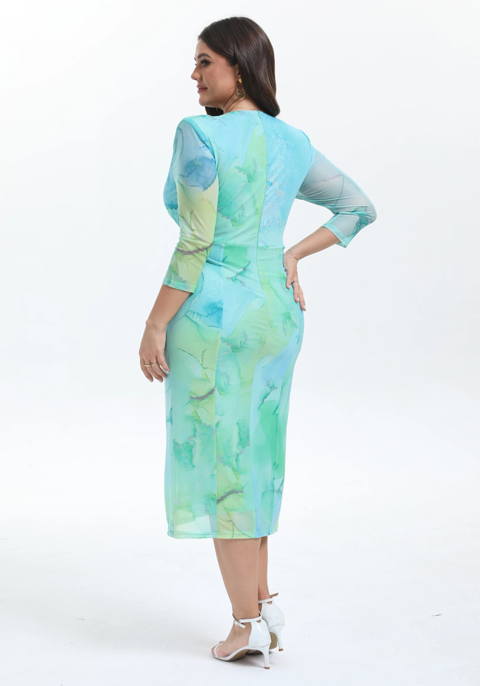 Το ελαφρύ, ημιδιάφανο ύφασμα με watercolor εμπριμέ αποχρώσεις χαρίζει χαρακτήρα και ιδανικά χρώματα για ανοιξιάτικες και καλοκαιρινές περιστάσεις. Η midi γραμμή το καθιστά ιδανικό για cocktail dress code, βάπτιση ή επίσημο κάλεσμα.