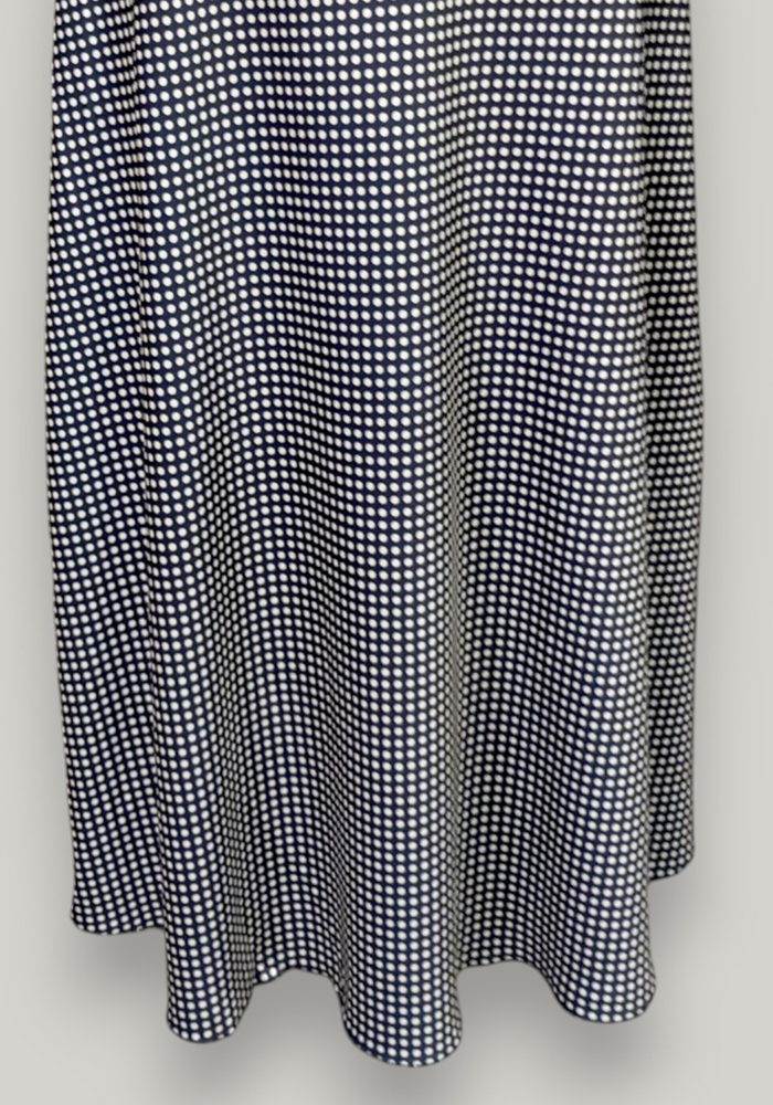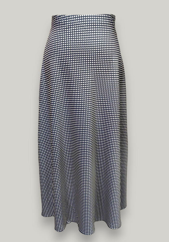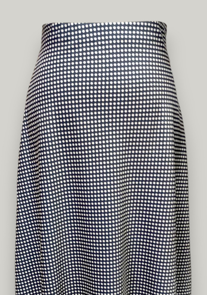 Η navy μπλε μακριά φούστα με πουά μοτίβο αποτελεί μία κομψή αλλά και ευέλικτη επιλογή για καθημερινές και επαγγελματικές εμφανίσεις. Η ελαφριά ρευστή γραμμή της αγκαλιάζει το σώμα και χαρίζει άνεση, ενώ το διαχρονικό πουά σχέδιο αποπνέει φρεσκάδα και θηλυκότητα. Ιδανική για office chic look με πουκάμισο ή πιο casual styling με t-shirt.