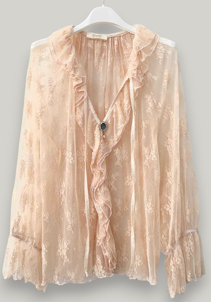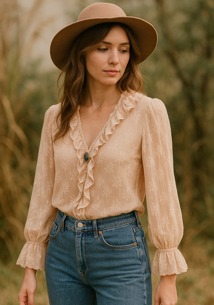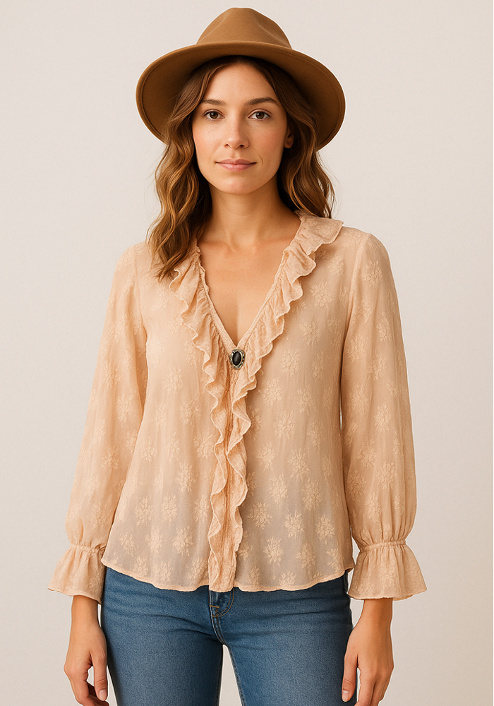 Η μπλούζα Victorian με βολάν και διακριτικό ανάγλυφο φλοράλ μοτίβο συνδυάζει το vintage ύφος με τη μοντέρνα θηλυκότητα. Το V λαιμόκομμα με ρέλι από βολάν και διακοσμητική καρφίτσα στο κέντρο προσθέτουν ιδιαίτερο χαρακτήρα, ενώ τα μανίκια με ελαφρύ όγκο και τελείωμα σε βολάν χαρίζουν αέρινη κίνηση. Ρομαντική διαφάνεια και διαχρονική κομψότητα σε μία μπλούζα που ξεχωρίζει. Ιδανική επιλογή για office looks, αλλά και για βραδινές εξόδους με ξεχωριστό στυλ.