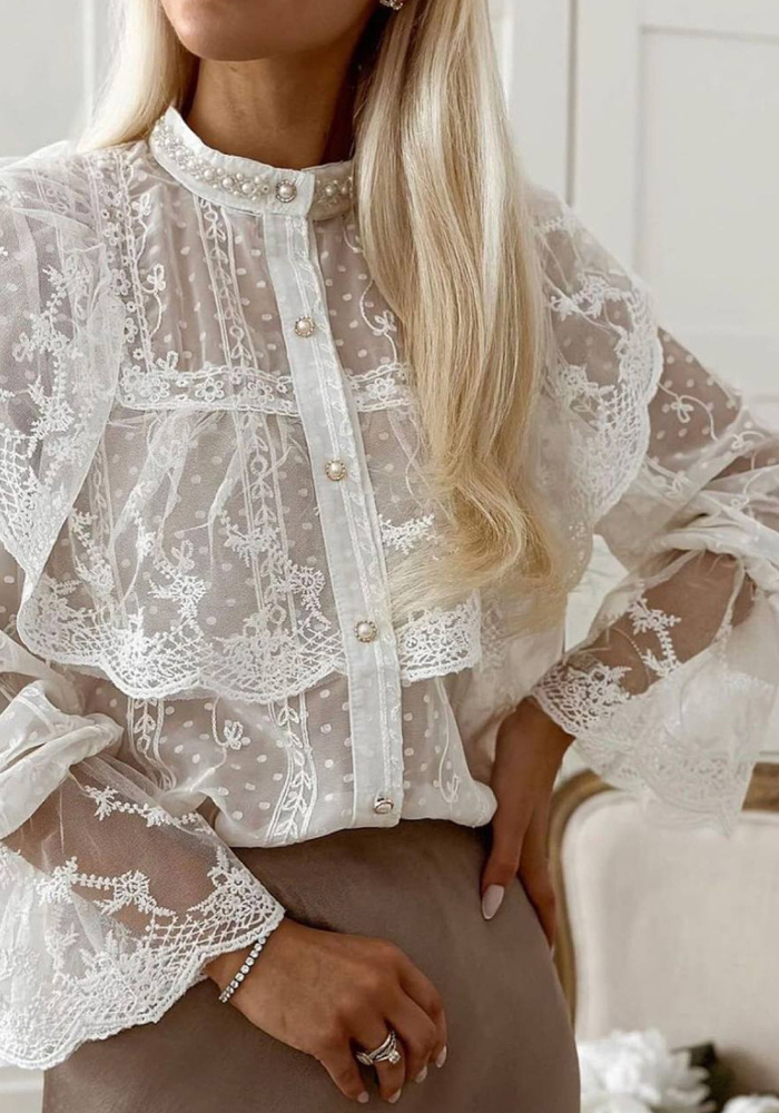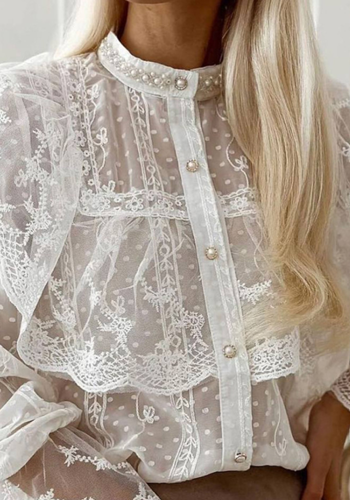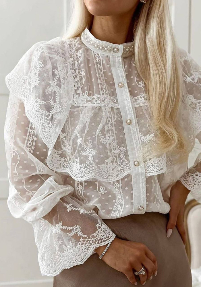 Λευκό δαντελένιο πουκάμισο σε ρομαντικό ύφος, με διάφανες λεπτομέρειες και κεντητά μοτίβα. Διαθέτει κουμπιά πέρλες μπροστά και στον γιακά, καθώς και εντυπωσιακά μανίκια με φαρδιές μανσέτες. Ένα κομμάτι που αποπνέει κομψότητα και θηλυκότητα, ιδανικό για συνδυασμούς σε ιδιαίτερες περιστάσεις ή chic καθημερινά outfits.
