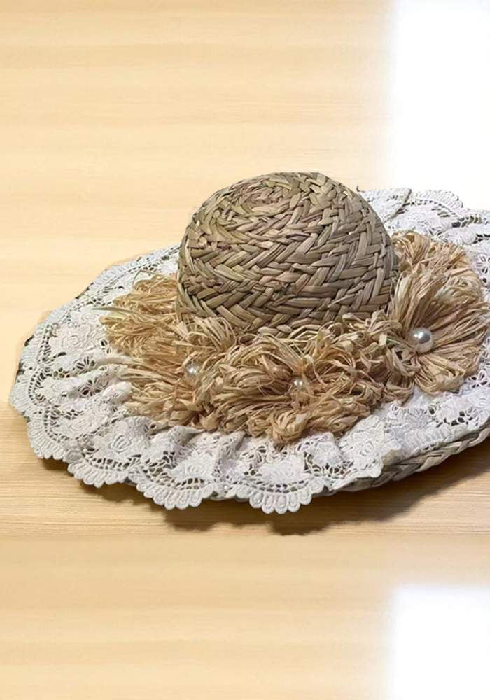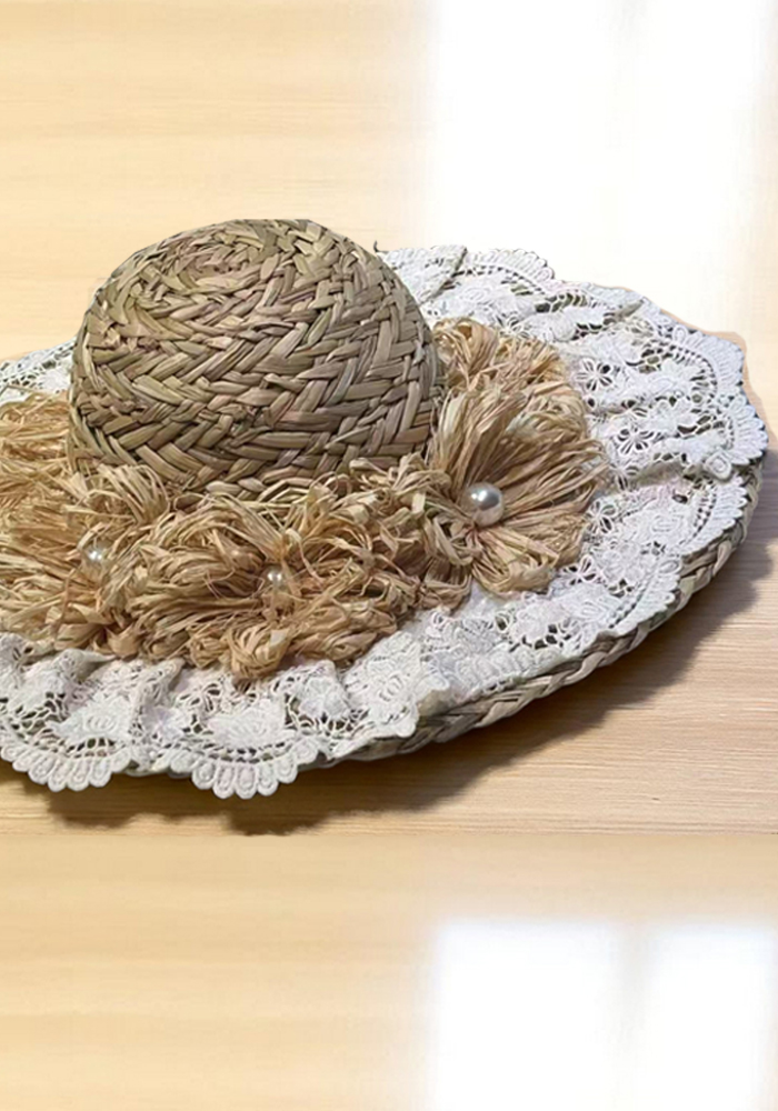 Αναδείξτε τη γυναικεία φινέτσα σας με αυτό το μοναδικό ψάθινο καπέλο που συνδυάζει φυσικά υλικά με ρομαντικές λεπτομέρειες. Το καπέλο είναι πλεγμένο από φυσική ψάθα και διακοσμημένο με δαντέλα υψηλής αισθητικής και εντυπωσιακές πέρλες, δημιουργώντας ένα κομψό και αριστοκρατικό αποτέλεσμα.