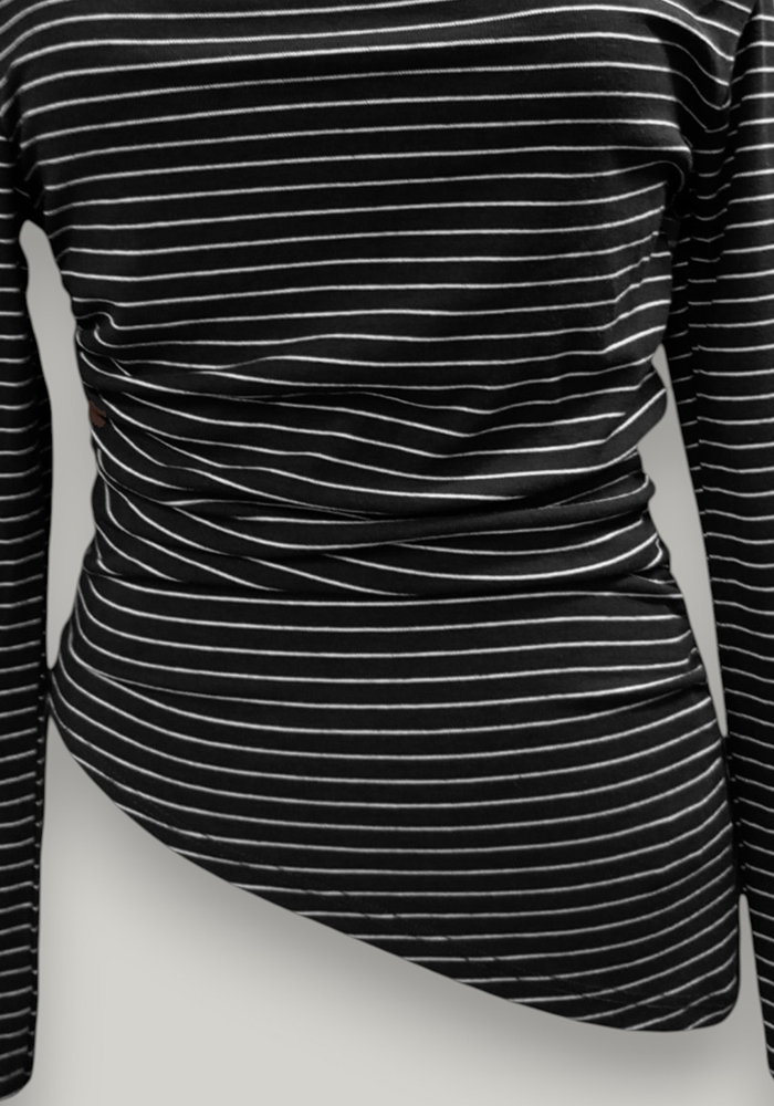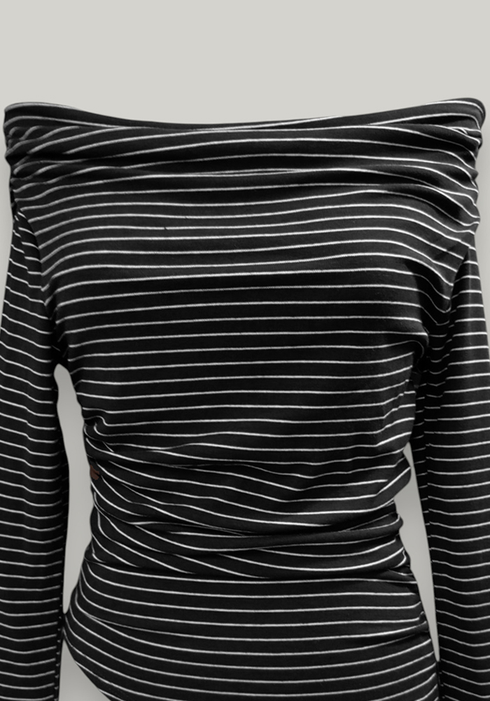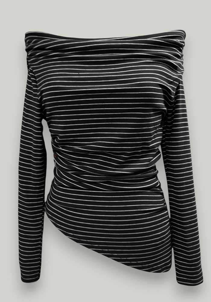 Γυναικεία μπλούζα με μαύρο και λευκές ρίγες, με ιδιαίτερο off-shoulder κόψιμο και ασύμμετρο τελείωμα. Το ελαστικό ύφασμα εφαρμόζει άνετα στο σώμα, αναδεικνύοντας τη σιλουέτα. Ιδανική επιλογή για κομψά casual looks ή για εμφανίσεις στο γραφείο με ξεχωριστό στυλ.