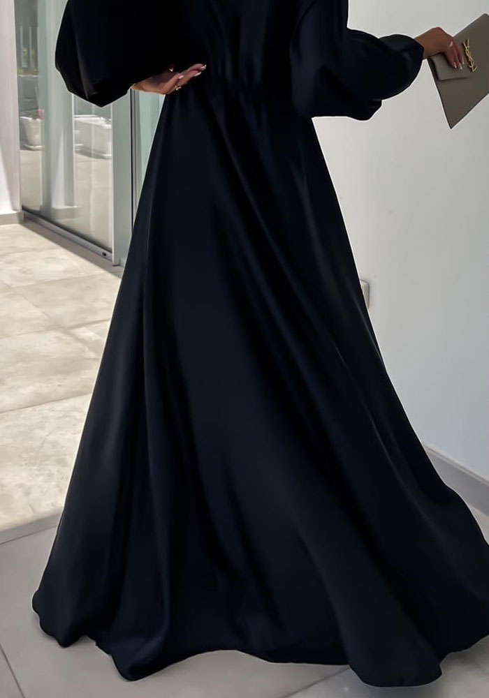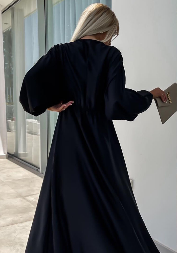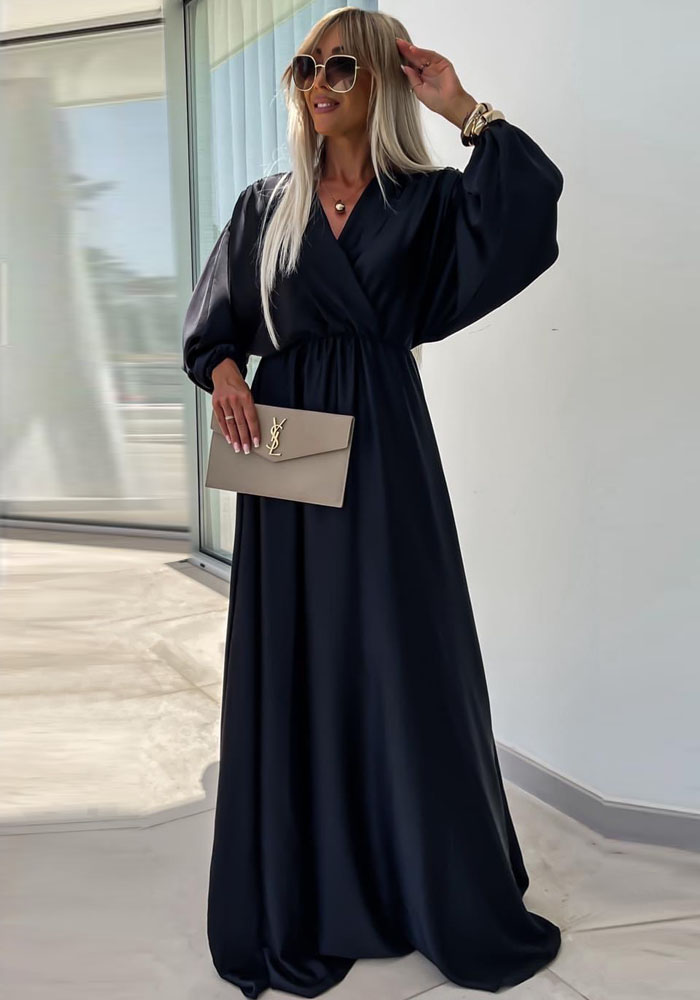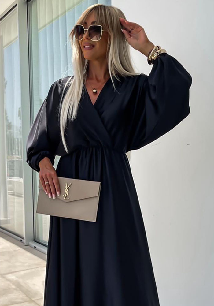 Επίσημο, maxi κρουαζέ, empire φόρεμα από medium shine σατέν. Έχει κολακευτικό V με σταύρωμα, αμπίρ κόψιμο κάτω απ΄το στήθος και άνετη κλος γραμμή. Τέλειο με statement κοσμήματα και ζώνες για special occasions!