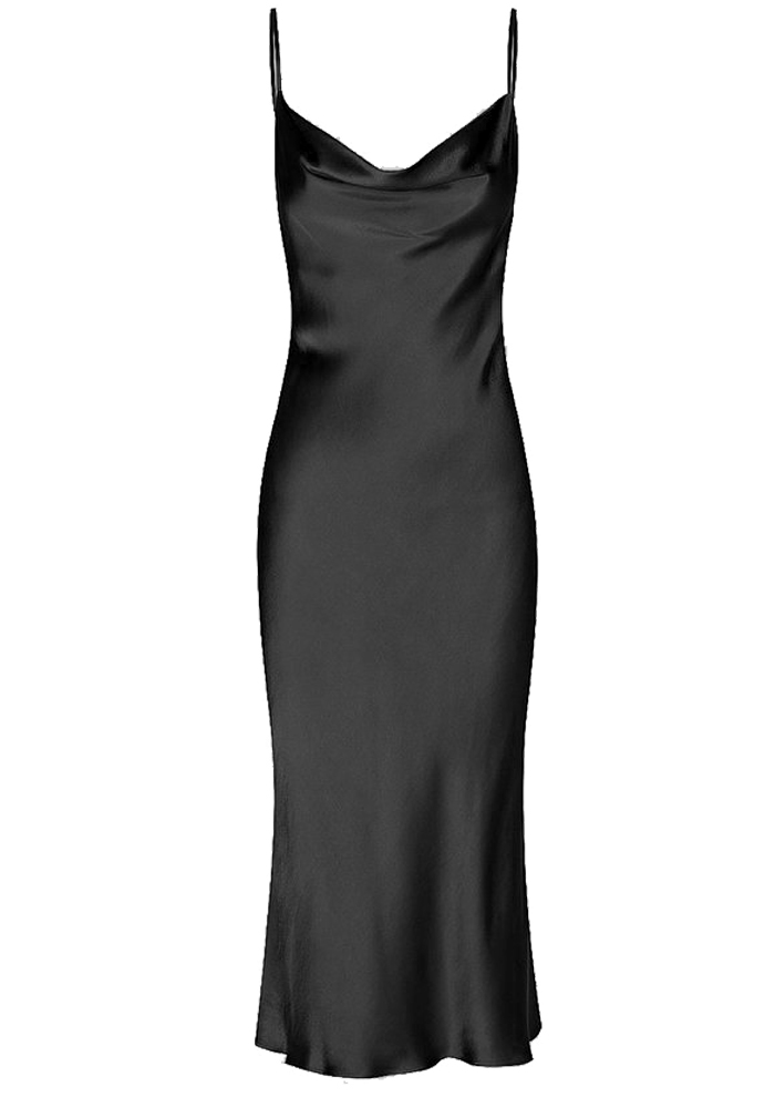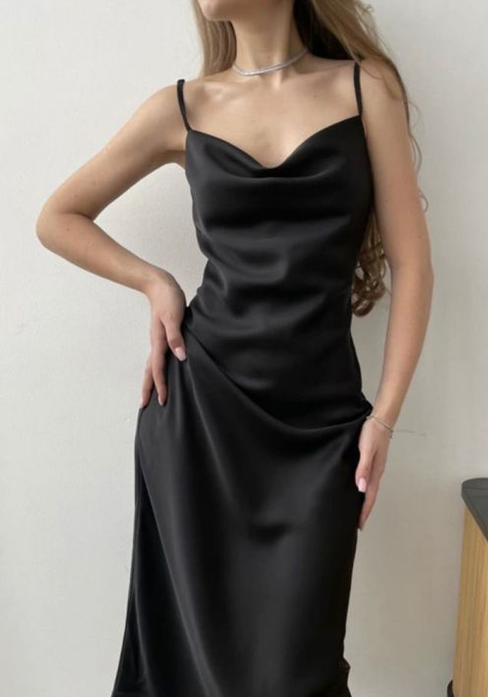 Φόρεμα από σατέν ύφασμα medium shine. Είναι σχεδιασμένο με ελαστικό τιραντάκι spaghetti, ντραπέ σχέδιο εμπρός και σκίσιμο στο πλάι. Συνδυάστε το ευρηματικά!