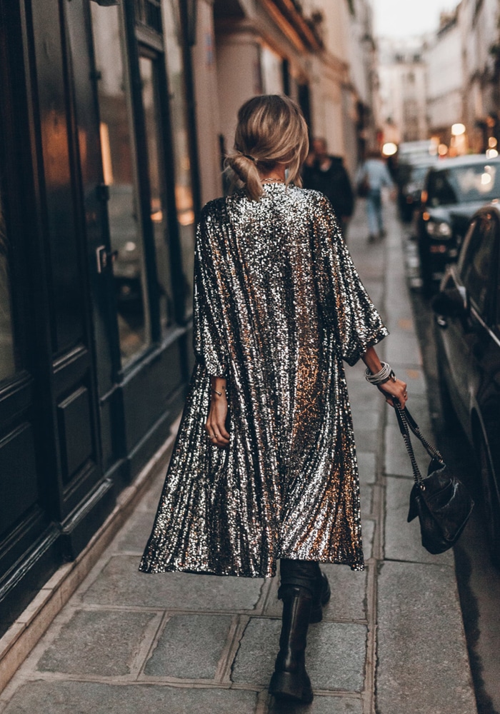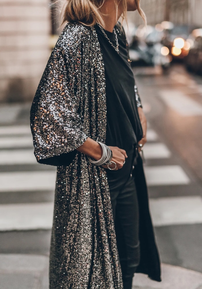 Must have ζακέτα / κιμονό σε shiny ύφασμα με mini παγιέτες. Έχει ίσια γραμμή, φαρδύ μανίκι 3/4, ελεύθερο και είναι φοδραρισμένο με ελαστικό jersey. Το απόλυτο festive, boho & chic item ανάλογα στο styling!