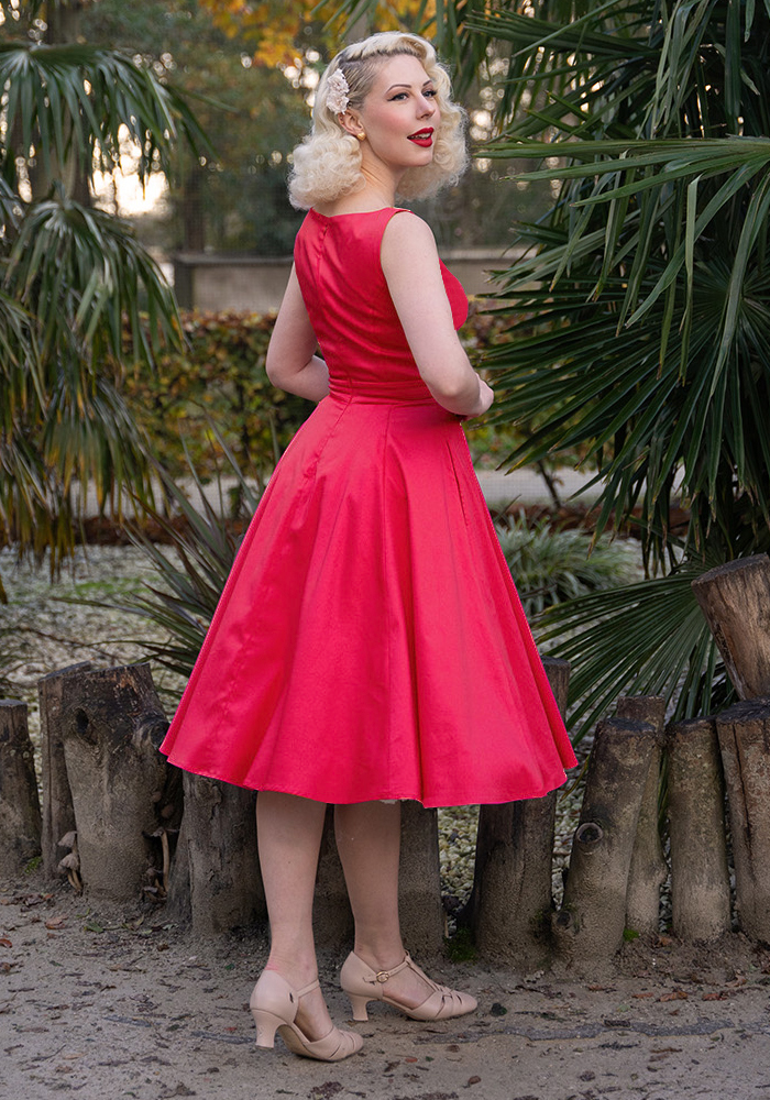 Το φούξια vintage φόρεμα με κλος φούστα προσφέρει καθαρή αισθητική και έντονη θηλυκότητα, με έμπνευση από τη διαχρονική κομψότητα των ’50s. Η minimal σχεδίαση σε έντονο φούξια απογειώνει τη σιλουέτα, ενώ η γραμμή fit & flare με πλούσια κλος φούστα προσδίδει φυσική κίνηση και κομψή αίσθηση.