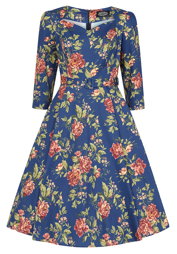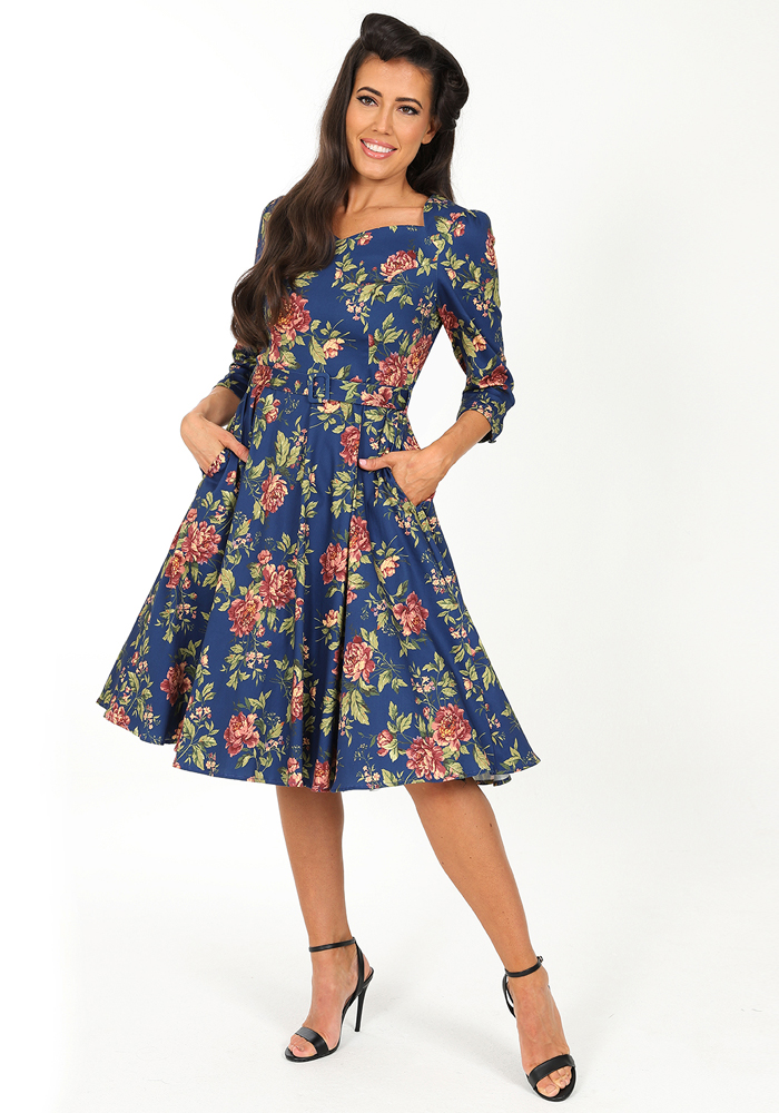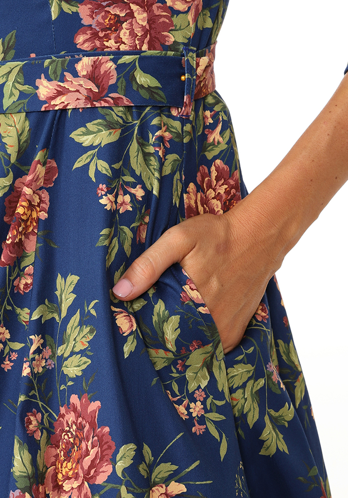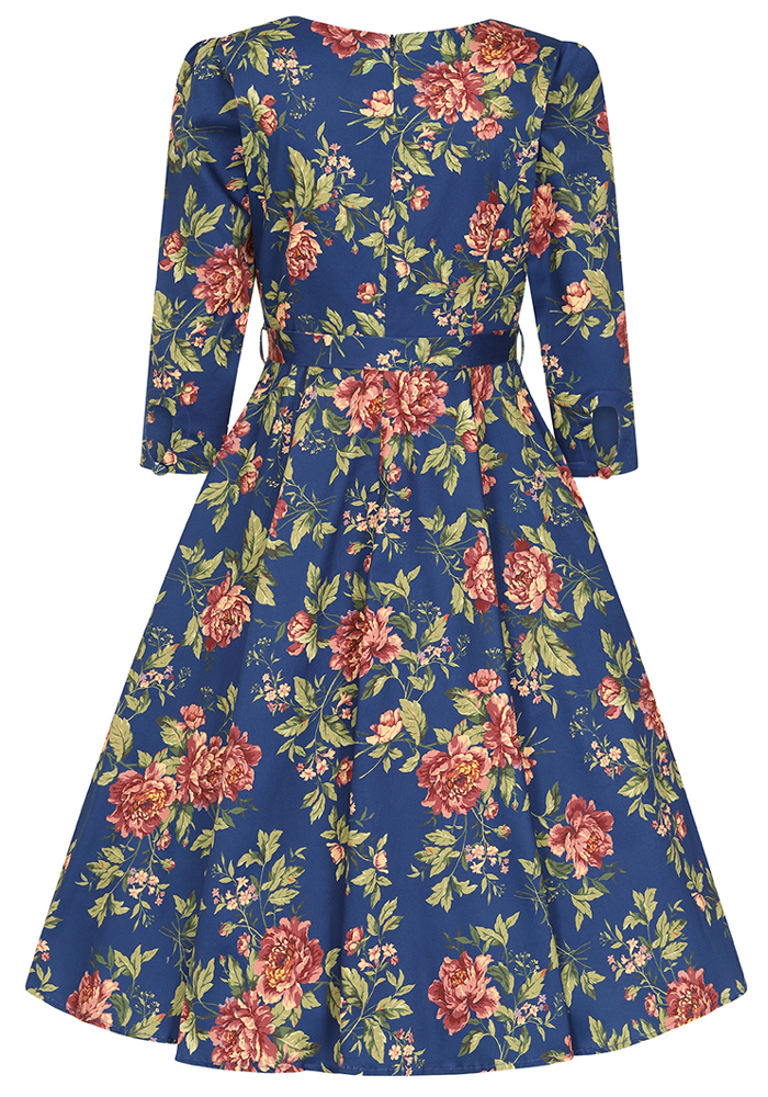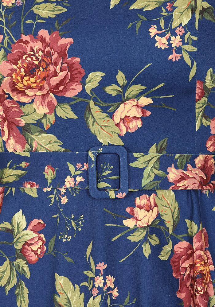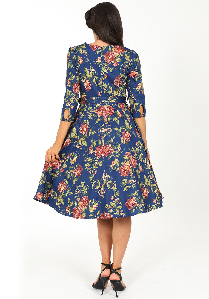 Το μπλε vintage floral φόρεμα River, με 3/4 μανίκι συνδυάζει τη ρομαντική γοητεία των ’50s με την ένταση του μπλε και την πολυπλοκότητα ενός floral μοτίβου. Το structured neckline με V άνοιγμα και η ενσωματωμένη ζώνη τονίζουν τη σιλουέτα, ενώ τα 3/4 μανίκια προσδίδουν διαχρονική φινέτσα και καθιστούν το φόρεμα κατάλληλο για μεταβατικές εποχές και πιο formal περιστάσεις.