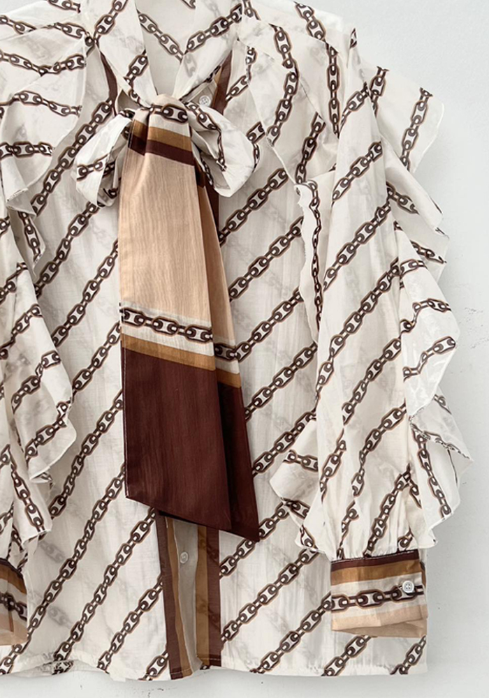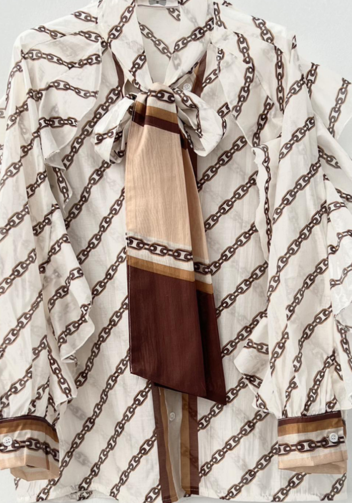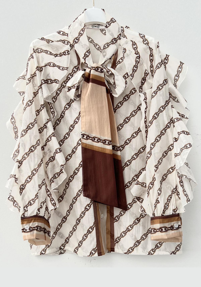 Αναβαθμίστε την κομψότητα των εμφανίσεων σας με αυτό το statement πουκάμισο σε εκλεπτυσμένο μοτίβο αλυσίδων. Διαθέτει εντυπωσιακά φουσκωτά μανίκια με βολάν και μανσέτες με κουμπί, ενώ η ενσωματωμένη φαρδιά γραβάτα στον γιακά χαρίζει πολυτελή, feminine αισθητική. Ο συνδυασμός μπεζ και καφέ αποχρώσεων δημιουργεί ένα κλασικό αλλά ταυτόχρονα μοντέρνο look, ιδανικό για day-to-night εμφανίσεις. Συνδυάζεται εύκολα με παντελόνια ή φούστες για επαγγελματικό ή κοσμικό στιλ.