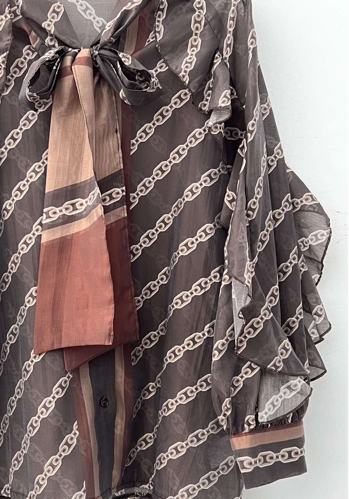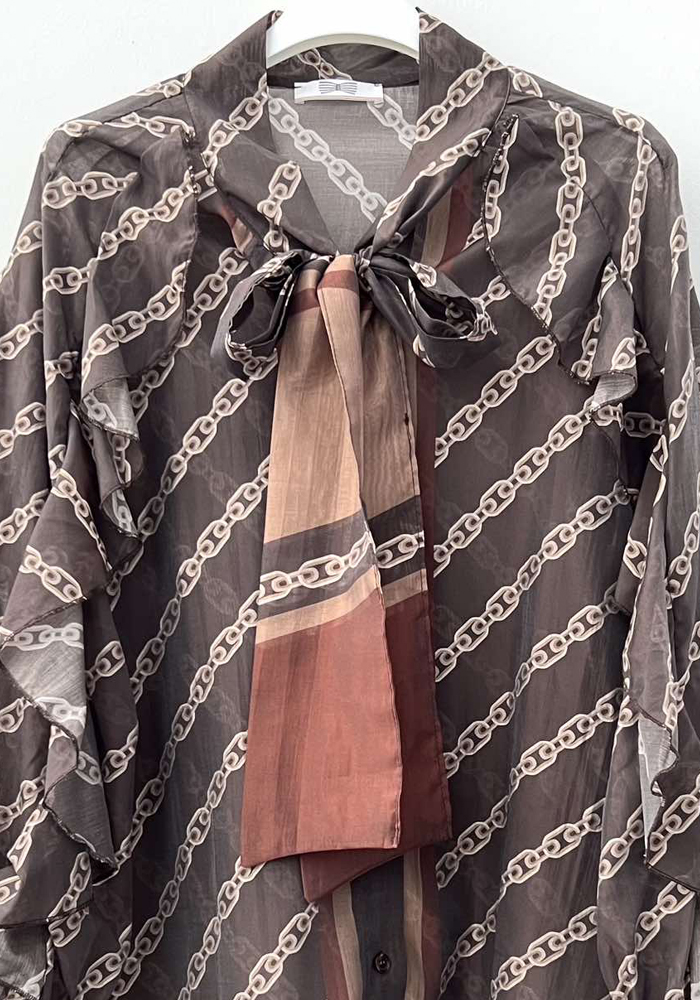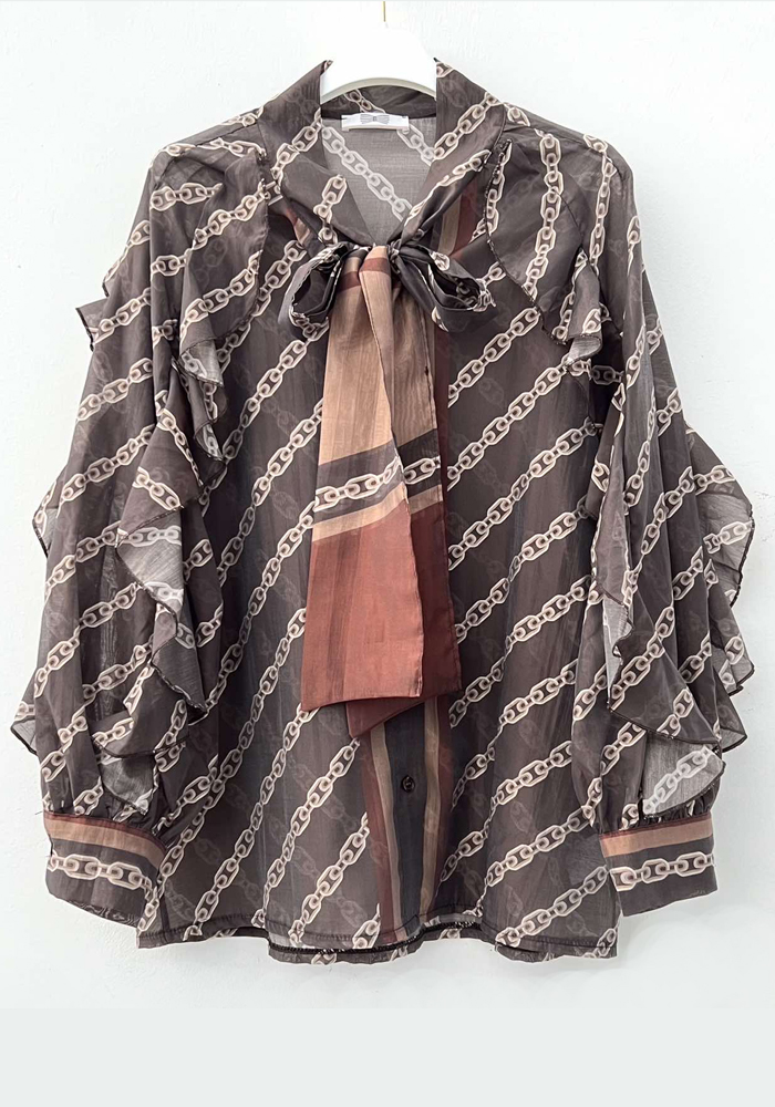 Αναβαθμίστε την κομψότητα των εμφανίσεων σας με αυτό το statement πουκάμισο σε εκλεπτυσμένο μοτίβο αλυσίδων. Διαθέτει εντυπωσιακά φουσκωτά μανίκια με βολάν και μανσέτες με κουμπί, ενώ η ενσωματωμένη φαρδιά γραβάτα στον γιακά χαρίζει πολυτελή, feminine αισθητική. Ο συνδυασμός μπεζ και καφέ- εκάι αποχρώσεων δημιουργεί ένα κλασικό αλλά ταυτόχρονα μοντέρνο look, ιδανικό για day-to-night εμφανίσεις. Συνδυάζεται εύκολα με παντελόνια ή φούστες για επαγγελματικό ή κοσμικό στιλ.
