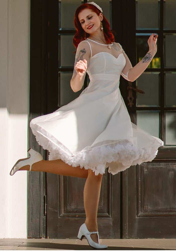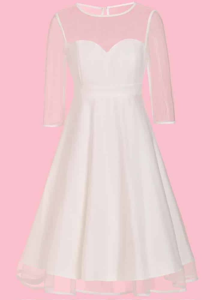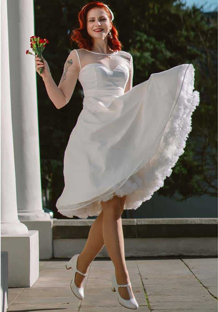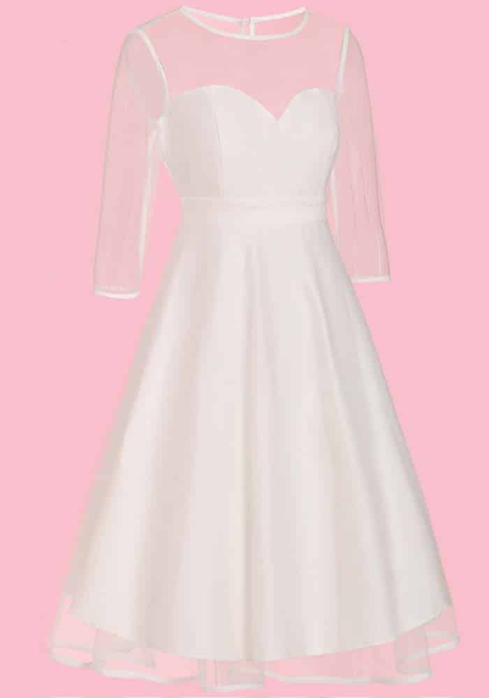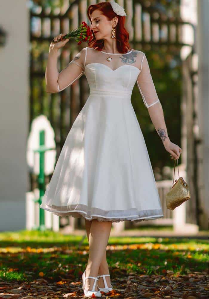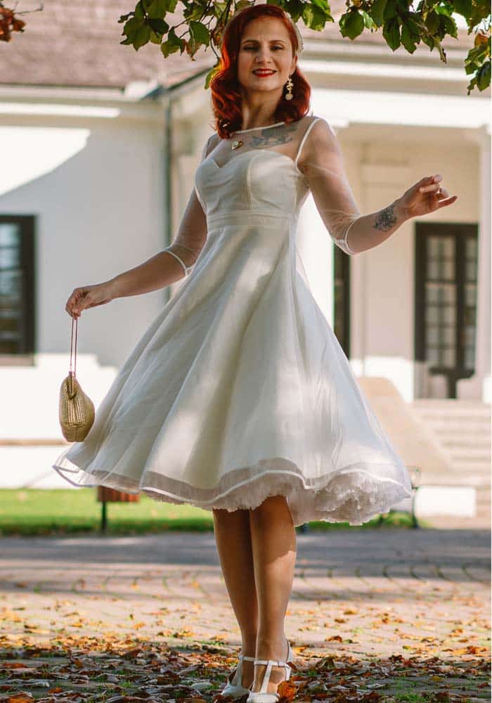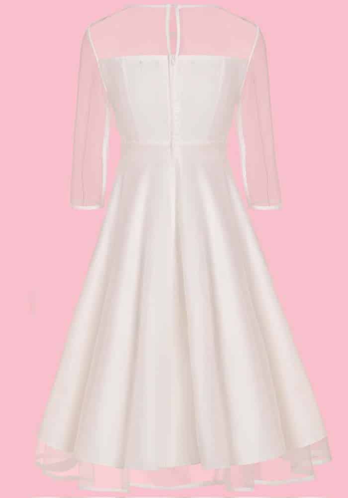 Bridal , ’50s vintage styled λευκό φόρεμα σε chic συνδυασμό υλικών. Είναι σχεδιασμένο σε μαλακό layer από τούλι πάνω σε cotton κορμό, με λαιμόκοψη sweetheart, structured κορμό & τονισμένη μέση και μανίκια ως τον αγκώνα. Το κάτω τμήμα είναι σε πλούσια κλος γραμμή. Δεν περιλαμβάνεται το φουρό. Ιδανική retro, feminine επιλογή για πολιτικό γάμο!
