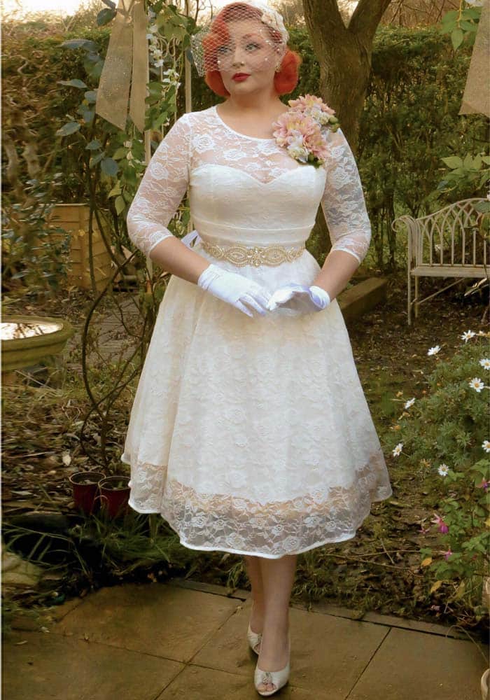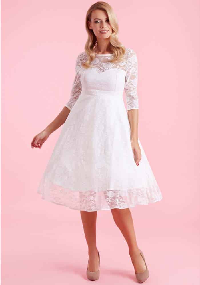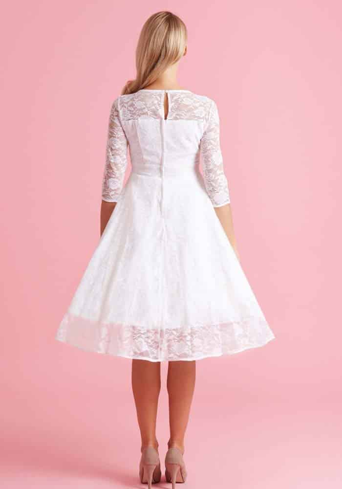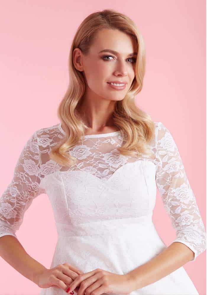 Bridal ’50s, vintage styled λευκό φόρεμα σε chic συνδυασμό υλικών. Είναι σχεδιασμένο σε μαλακό layer από δαντέλα chantilly πάνω σε cotton κορμό, με λαιμόκοψη sweetheart, structured κορμό & τονισμένη μέση και μανίκια 3/4. Το κάτω τμήμα είναι σε πλούσια κλος γραμμή. Δεν περιλαμβάνεται το φουρό. Ιδανική retro, feminine επιλογή για πολιτικό γάμο!