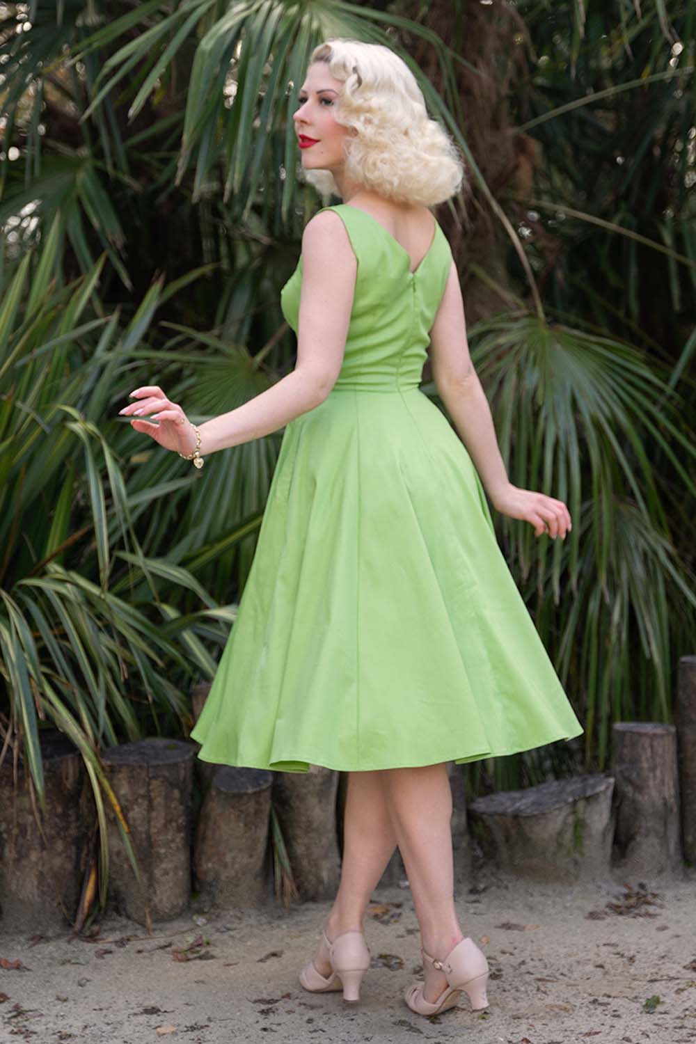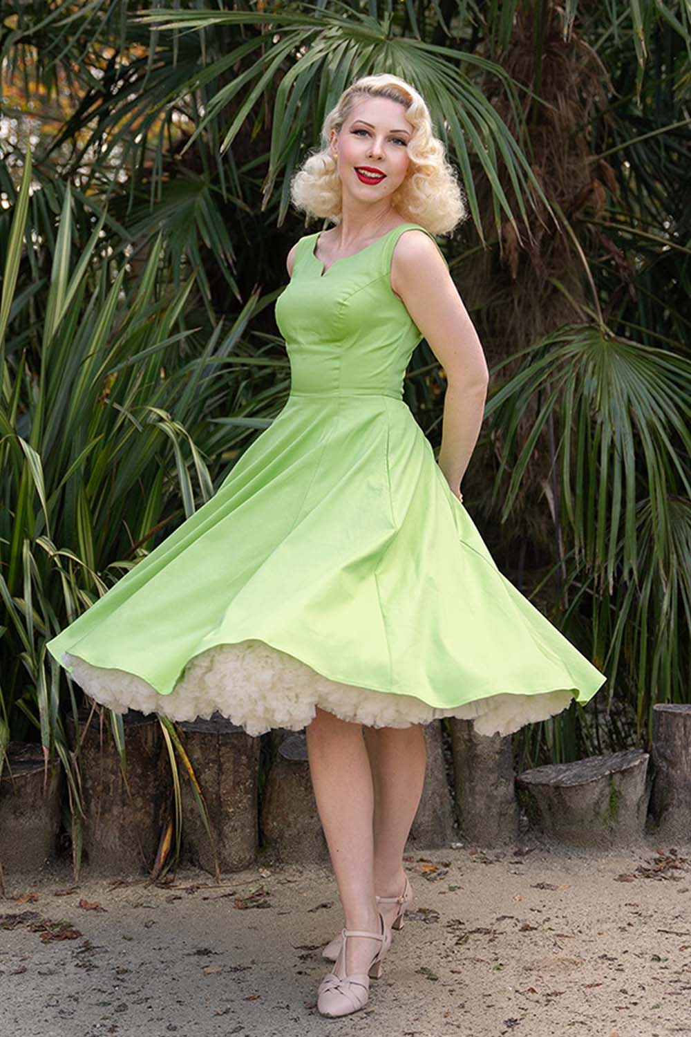 Vintage ’50s styled, classic αμάνικο midi φόρεμα από high quality cotton με ελαστικότητα. Είναι σχεδιασμένο με chic V με cut out σχέδιο, εφαρμοστό κορμό με ραφές, τονισμένη μέση και τσέπες. Έχει πλούσια κλος γραμμή και ταιριάζει απόλυτε με statement ζώνες. Must have retro piece!