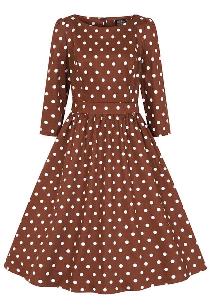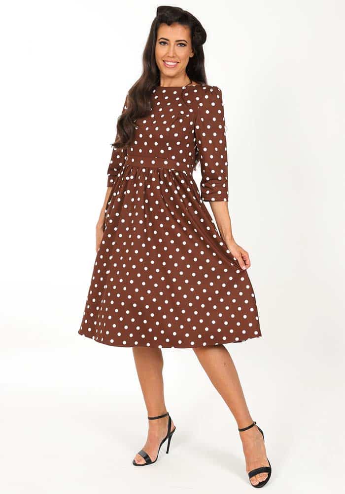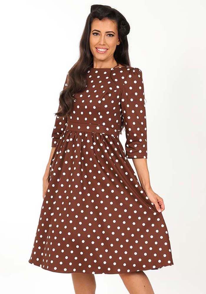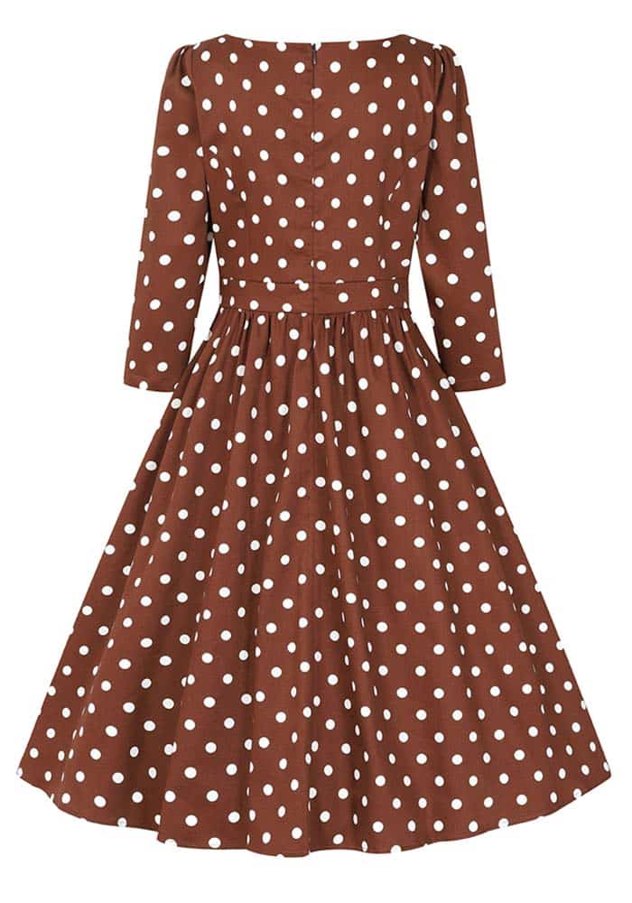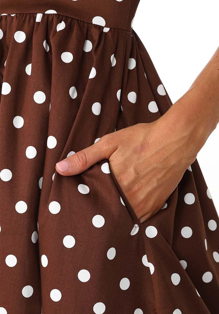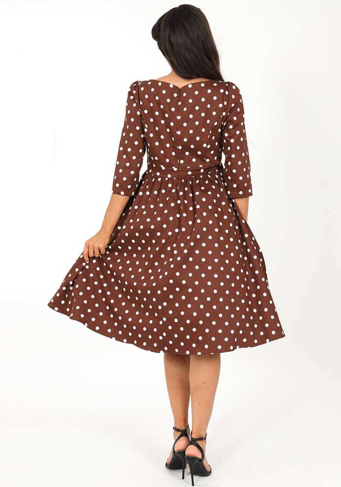 Vintage ’50s styled, πουά midi φόρεμα από high quality cotton καπαρντίνα με ελαστικότητα. Είναι σχεδιασμένο με εφαρμοστό κορμό με ραφές ρεντιγκότας, λαιμό bateau, μανίκια 3/4 & φάσα που τονίζει τη μέση. Το κάτω τμήμα είναι με τσέπες, σούρες & πλούσια κλος γραμμή. Classic piece με retro style!