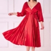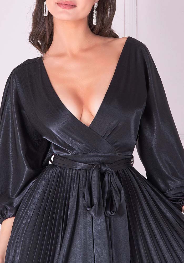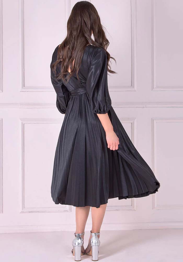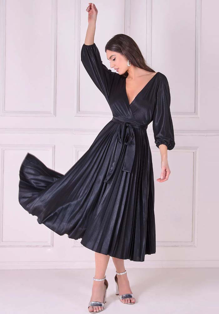 Luxurious, midi φόρεμα από high quality twill σατέν, medium shine. Είναι σχεδιασμένο σε γραμμή V κρουαζέ, τονισμένη μέση με matching ζώνη, μανίκια 3/4 & άνετη κλος φούστα με εντυπωσιακή κίνηση. Υπέροχη επιλογή για special occasions!