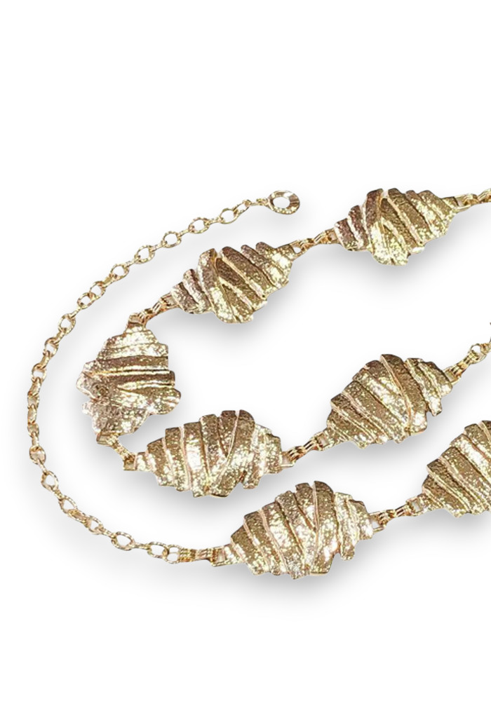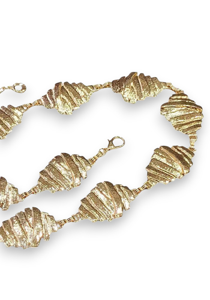 Η γυναικεία ζώνη αλυσίδα Croissant σε χρυσό χρώμα με ανάγλυφα γεωμετρικά στοιχεία σε σπειροειδές σχέδιο είναι το απόλυτο fashion accessory για κάθε εμφάνιση. Κομψή και εντυπωσιακή, φοριέται πάνω από φορέματα, πουκάμισα ή παντελόνια, προσδίδοντας πολυτέλεια και δυναμισμό στο στυλ σας. Ο ρυθμιζόμενος κρίκος εξασφαλίζει άνετη εφαρμογή και ευελιξία, ενώ ο μοναδικός σχεδιασμός την καθιστά statement κομμάτι.