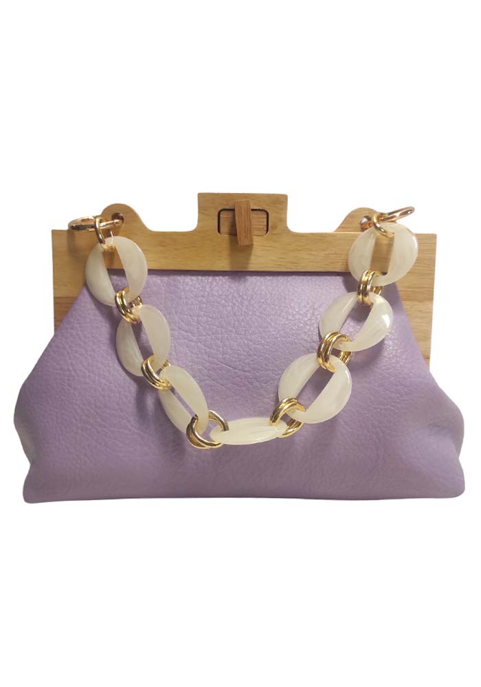 Τσάντα faux leather με ξύλινο κούμπωμα και αλυσίδα χειρός Υλικό: Δερματίνη / Ξύλο Χρώμα: Μωβ Διαστάσεις: 25 x 15 x 9εκ. Διαθέτει και extra χρυσή αλυσίδα ώμου
