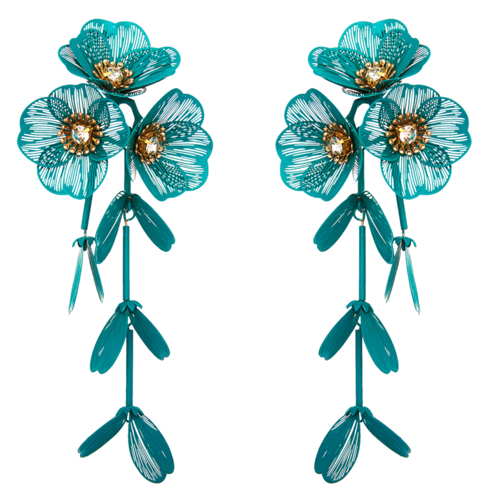 Σκουλαρίκια κρεμαστά, μακριά απο μέταλλο και στρας σε σχέδιο λουλούδι Διαστάσεις: Mήκος 12cm Χρώμα: Τυρκουάζ