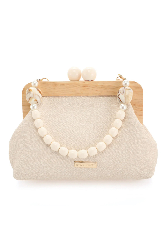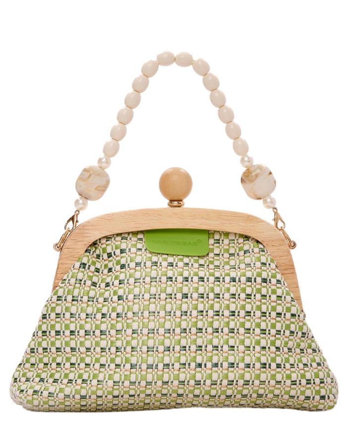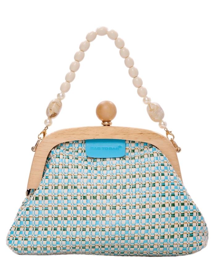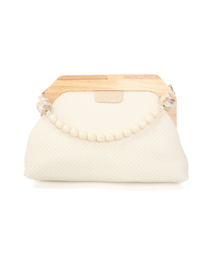 Vintage styled τσάντα/ φάκελος με ξύλινο πλαίσιο και wooven ύφασμα Αποτελείται από ένα ενιαίο χώρο Διαθέτει αποσπώμενο λουράκι με πέρλες Διαστάσεις: • Πλάτος: 7 cm • Μήκος: 28 cm • Ύψος: 19 cm